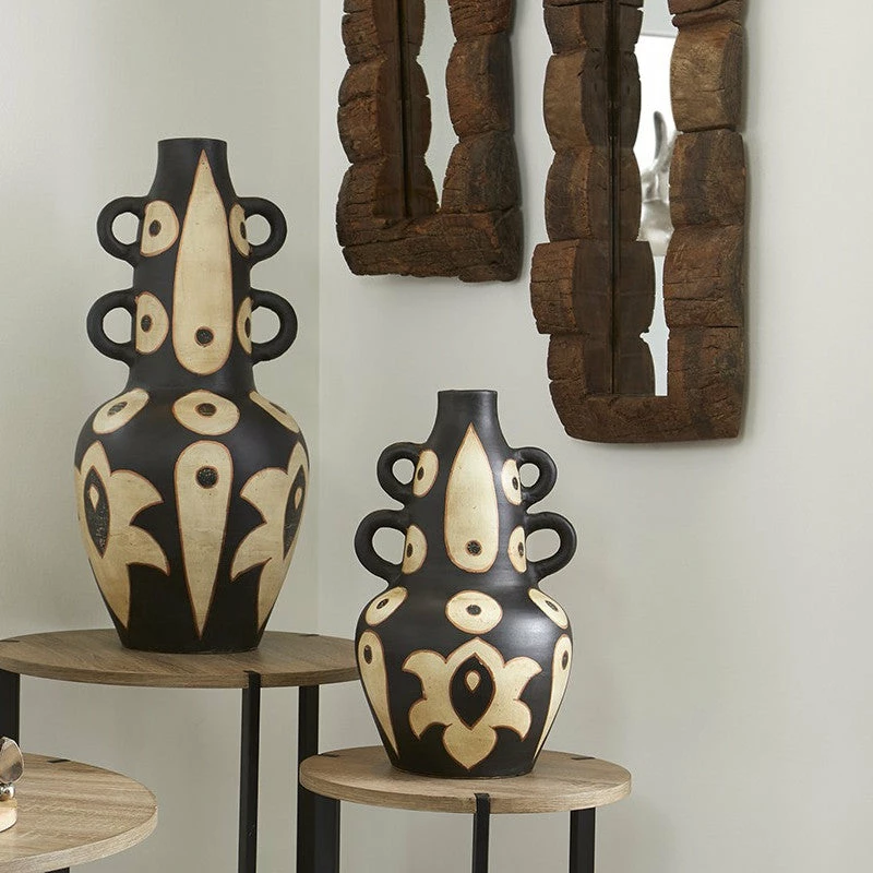 Balance rustic native style and contemporary appeal on any tabletop design with the geometrically inspired Navajo vase collection. This pair features a slate black design and detailed beige, brown and bronze accents, on a scaled up terracotta frame. For a touch of boho-chic contrast, let these vases hold a blossoming arrangement then set it on a dining table for a simple yet sophisticated centerpiece to your entertainment ensemble.