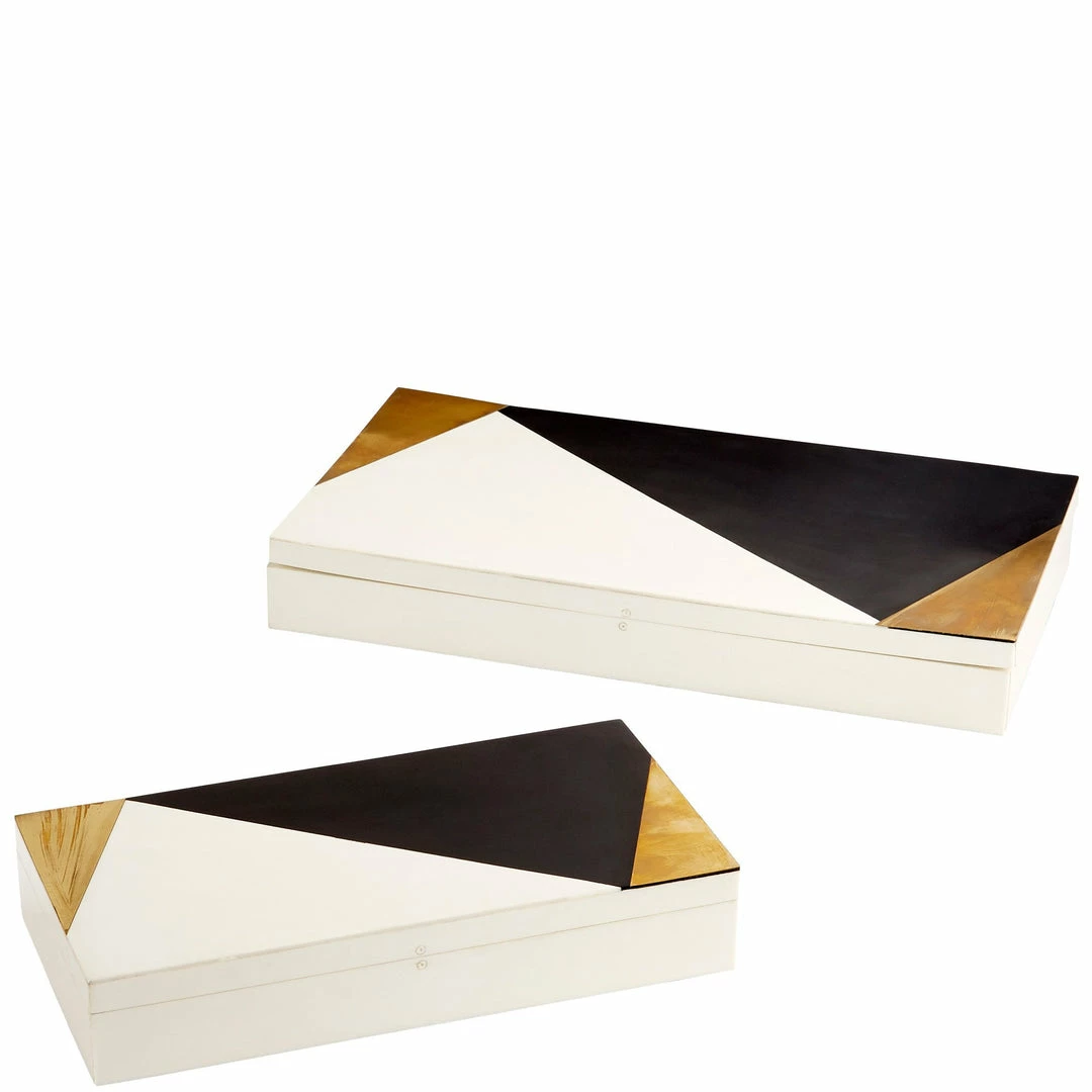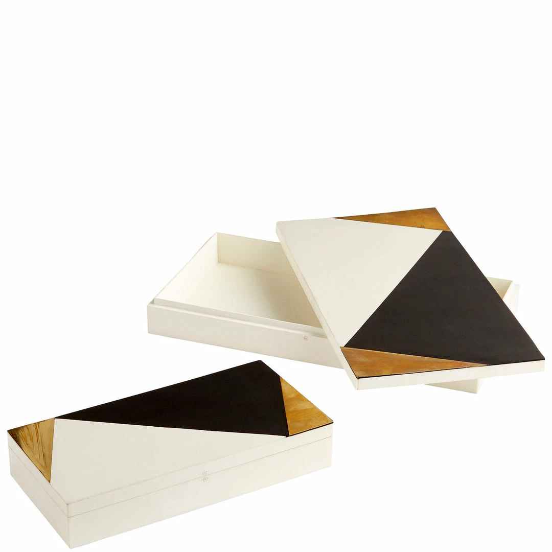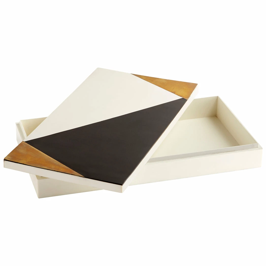 Mid-Century loveliness graces this classic geometric, angular container. Black Gold and White adorn the surface of the lid of this box. Store your jewelry, small electronics, trinkets, or any other personal items in the Modametric container. Available in a small and large option for added versatility.