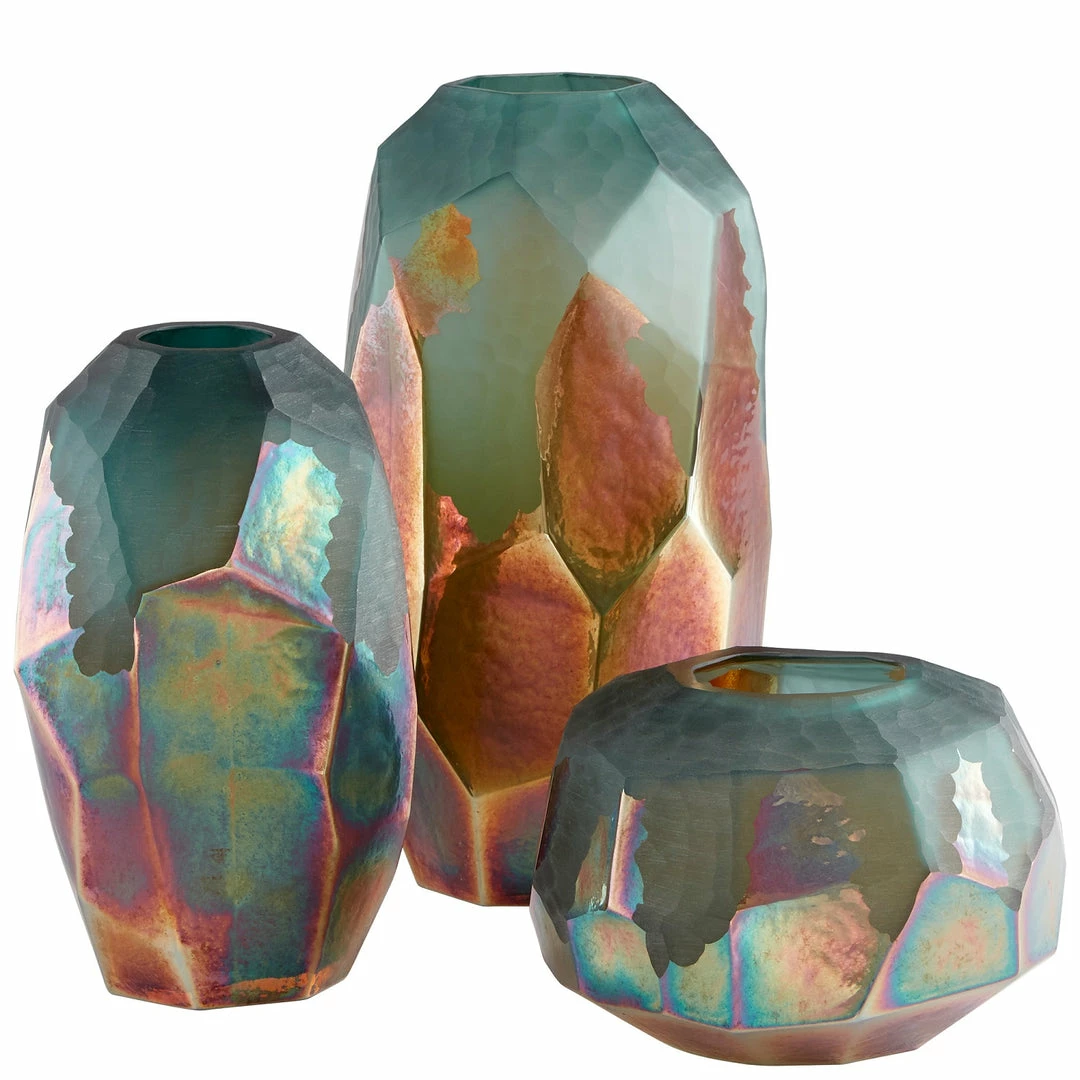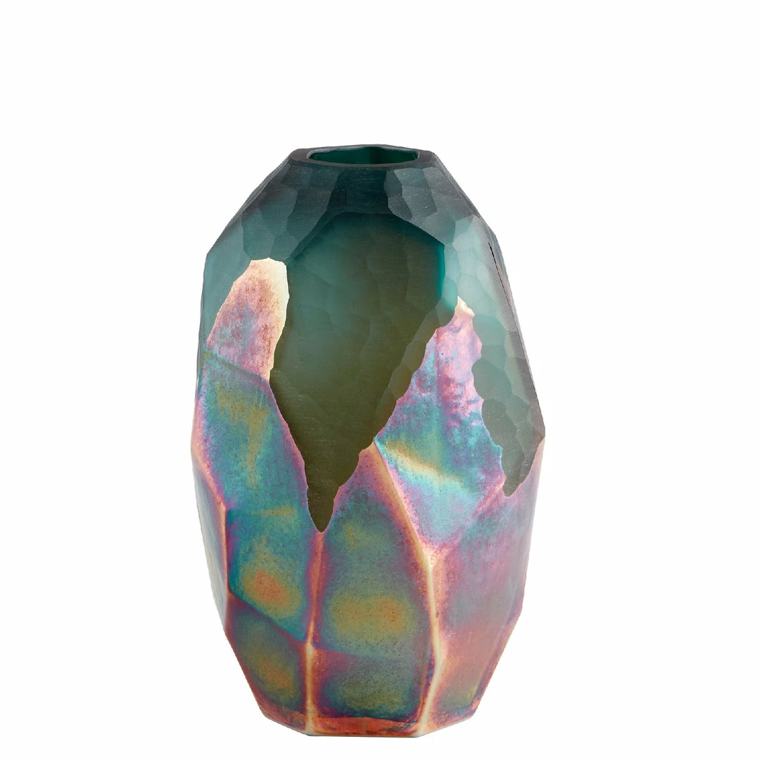 The Roca Verde vase is truly a unique tabletop accent. Showcasing a vibrant, two-toned green and gold surface finish on a geometrically inspired formation, this piece of glassware is the perfect addition to any modern, residential living space or commercial design project. Wow guests by displaying your seasonal floral arrangements in this unique and abstract vessel.