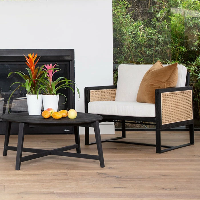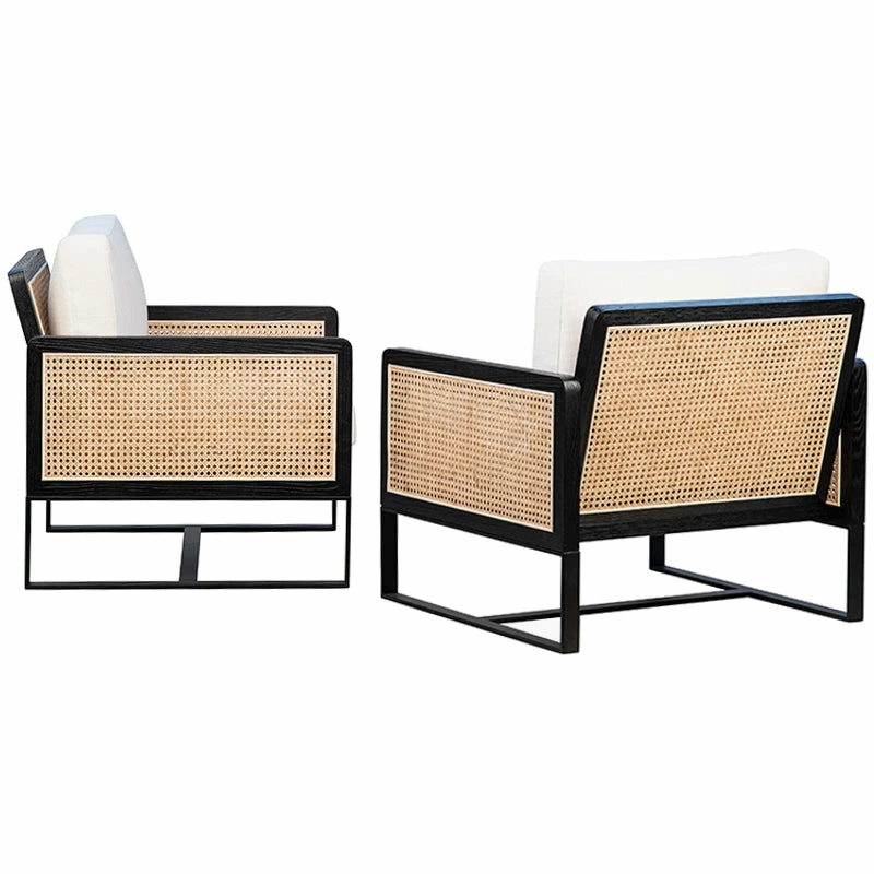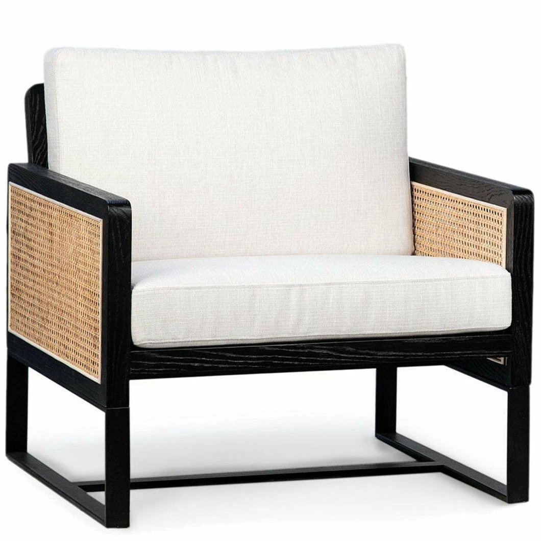 Mixed materials refresh retro Palm Springs inspiration. The boxy ebony oak wood frame provides perfect contrast to the textural inlayed panels of natural cane. The white cotton seat cushions are removeable for easy care making the Vizcaya Cane Chair both a stylish and sensible seating option.