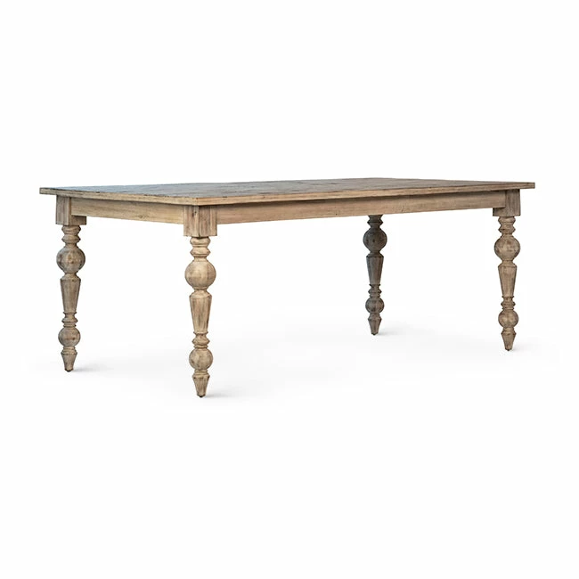 The Idella Dining Table has an elegant form crafted from reclaimed acacia wood in a vintage warm wash finish. Hand turned legs bring a sculptural element to the piece and add to its lived-in charm.