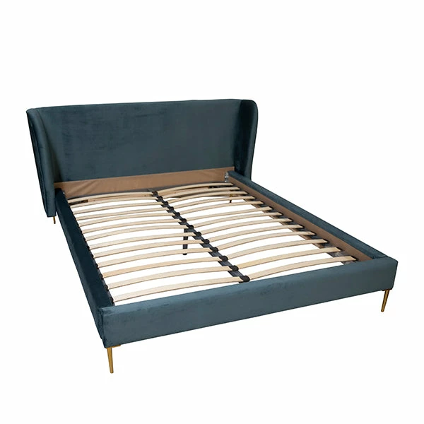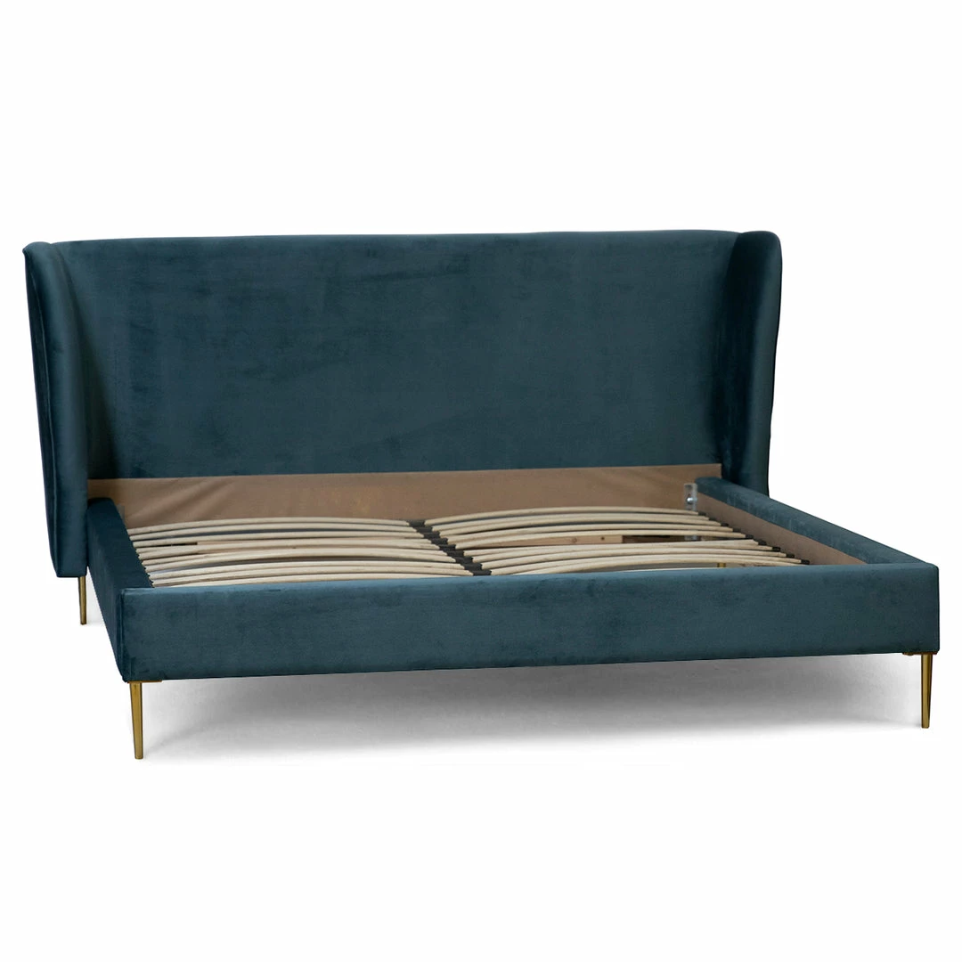 Featuring a plush shelter-style headboard, soft velvet upholstery, and brass metal legs, this casual cool bed will be your new favorite lazy Sunday lounge spot. This platform bed includes a full set of slats and a low-profile box-spring is recommended but not required. We also highly recommend getting a breakfast in bed tray to complete the look. ๐