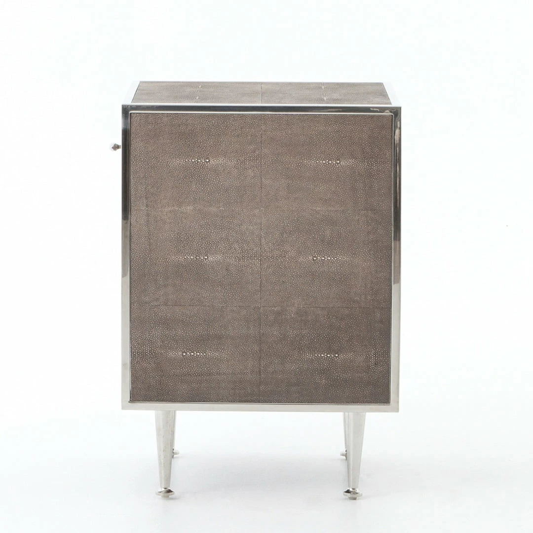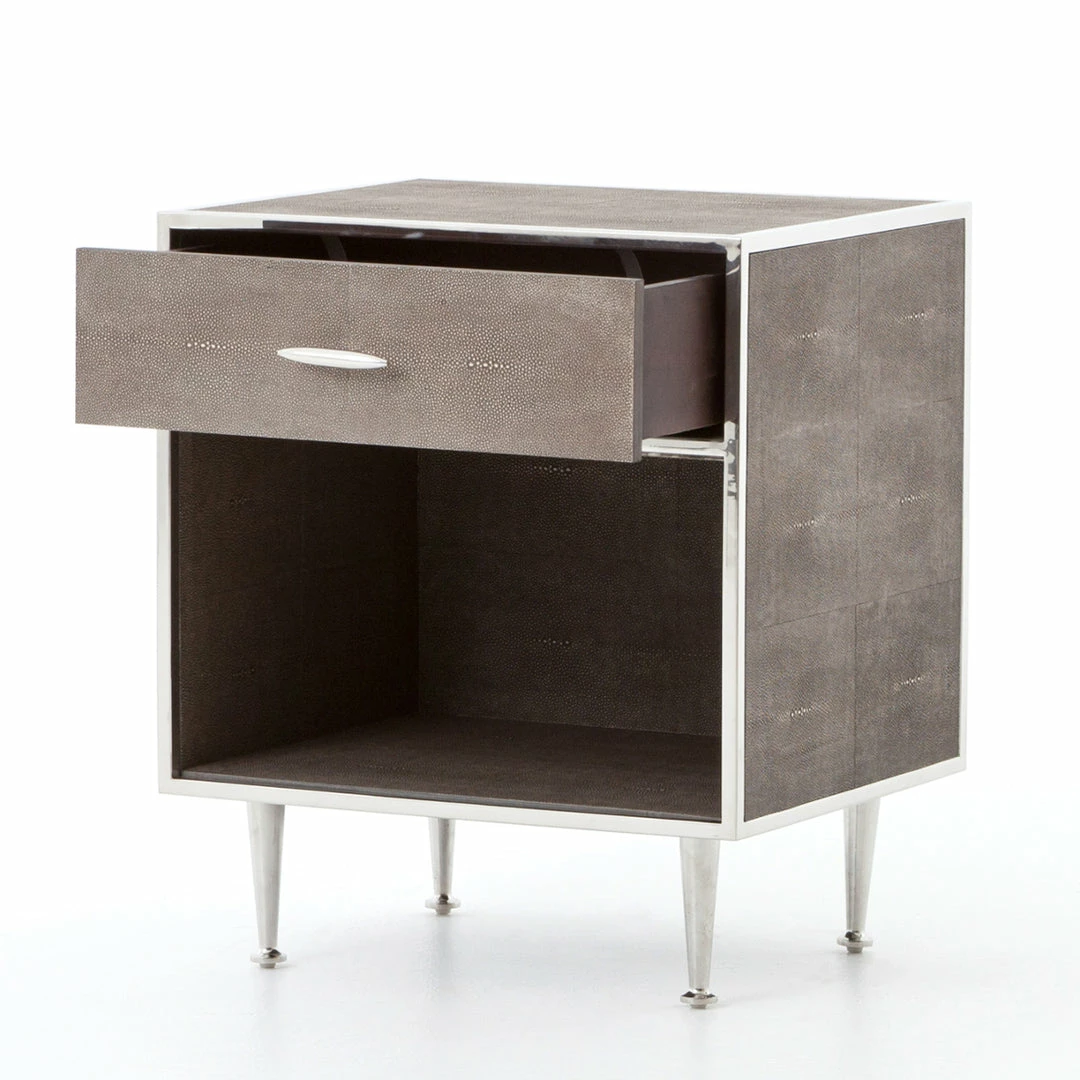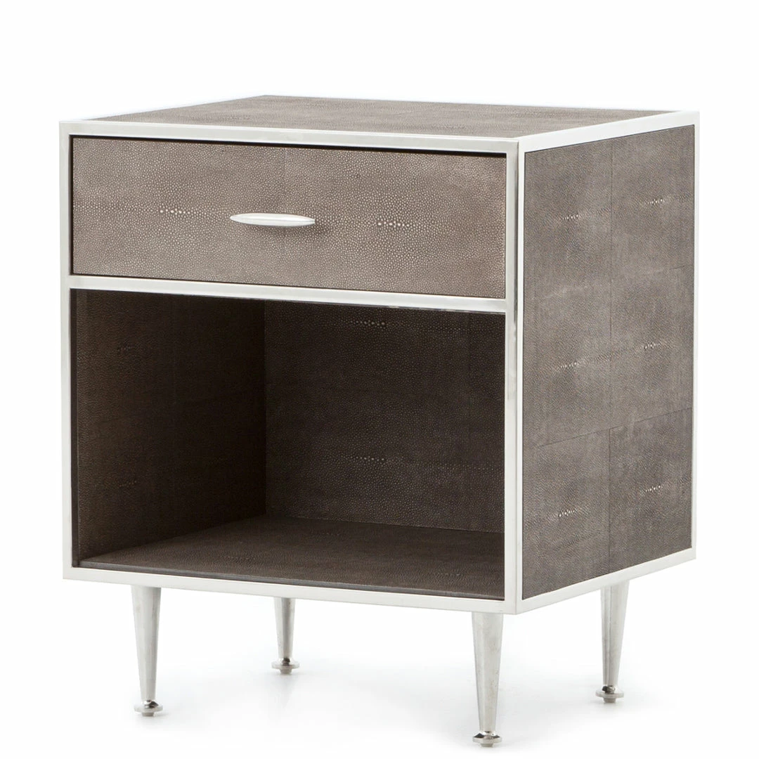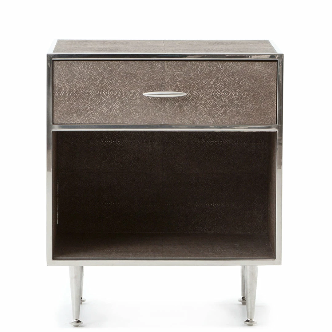 This mid-century modern one-drawer nightstand is covered in brown resin faux shagreen and trimmed in polished stainless steel for contrast. Set on tapered metal legs, Andel features an open shelf design to display your favorite books and accessories.