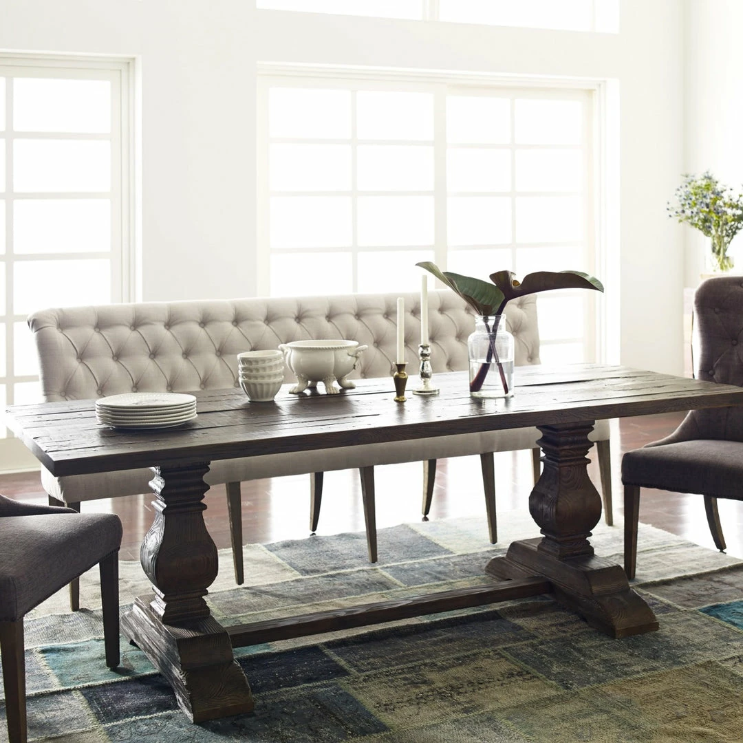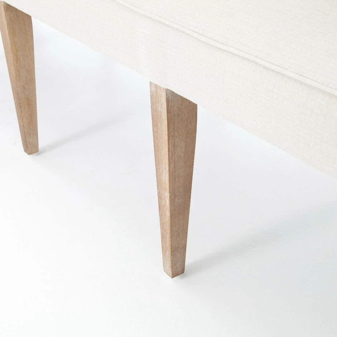 A classic long banquette with traditional deep tuftng, soft curves, splayed legs, and a contemporary casual light sand upholstery perfect for the modern eclectic setting.Β