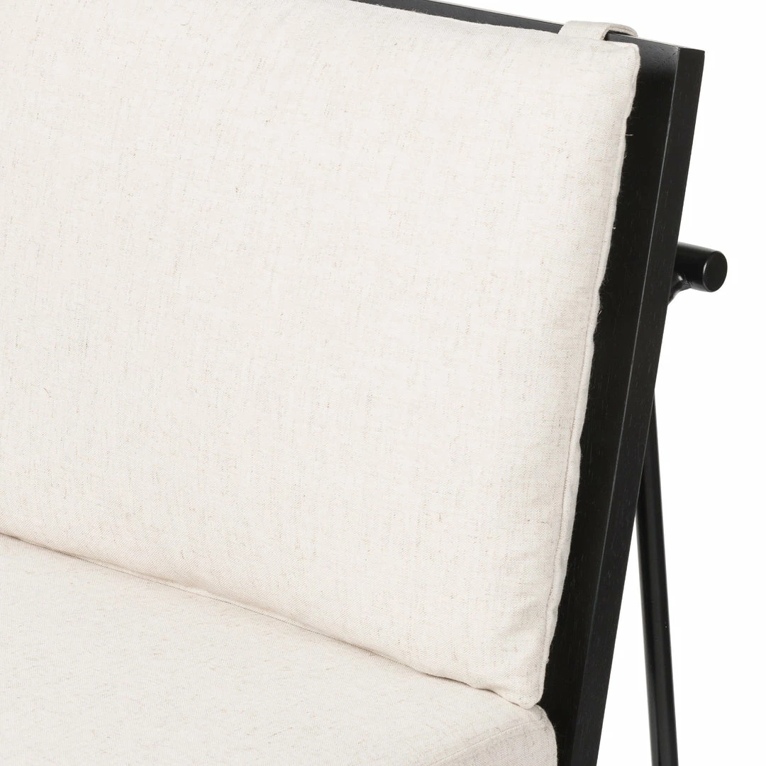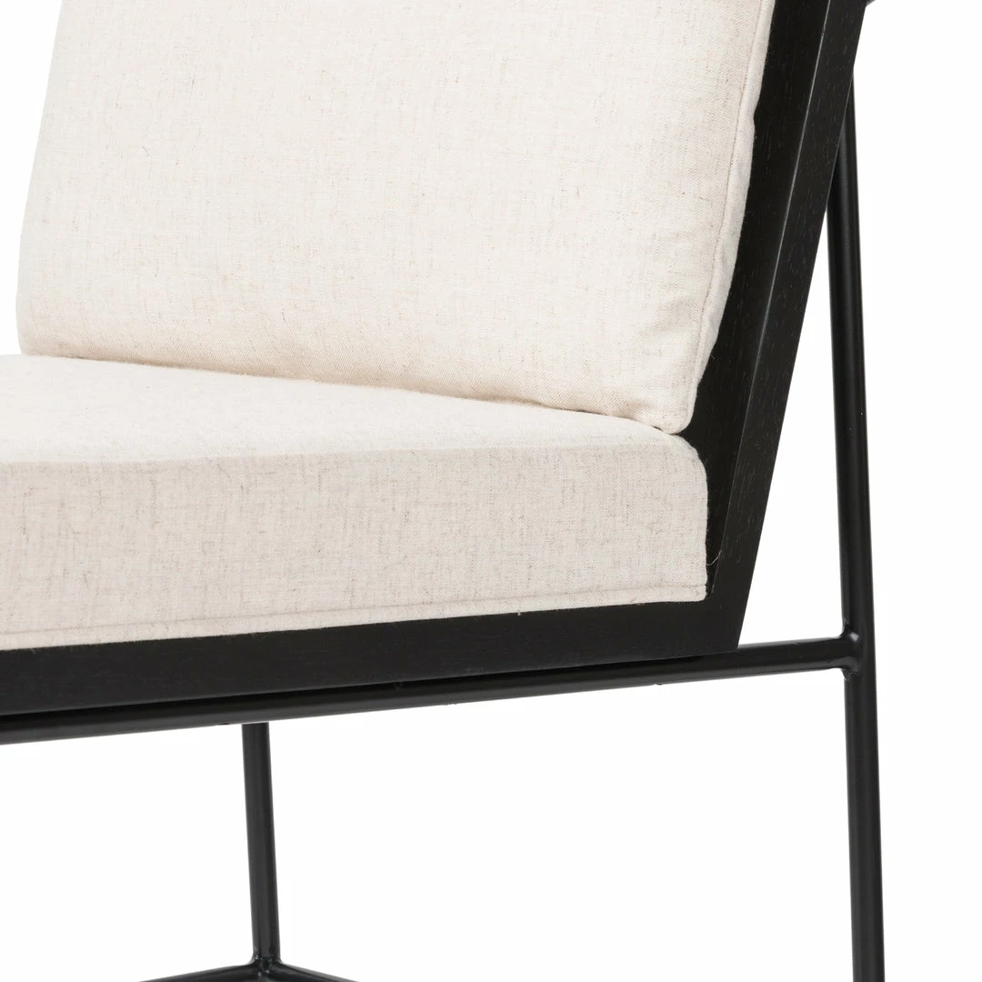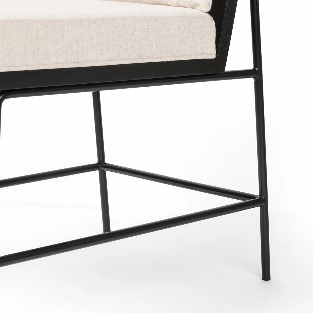 A perfect mix of materials come together in this structured design. Slim, black-finished iron frames a floating ladderback of brushed ebony-finished parawood and topped with cream-colored linen-blend seating. Rear handle detail adds a fashionable finishing touch.