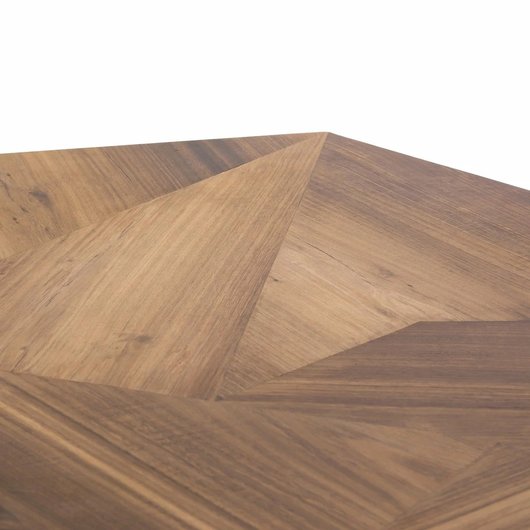 Blonde yukas woods are blended and smoothed for a soft look with rich depth. Asymmetric sides form a casual octagon, bringing re-imagined geometry to the table.ย With the natural quality of this material, each table will have its own slight variation in grain and color.