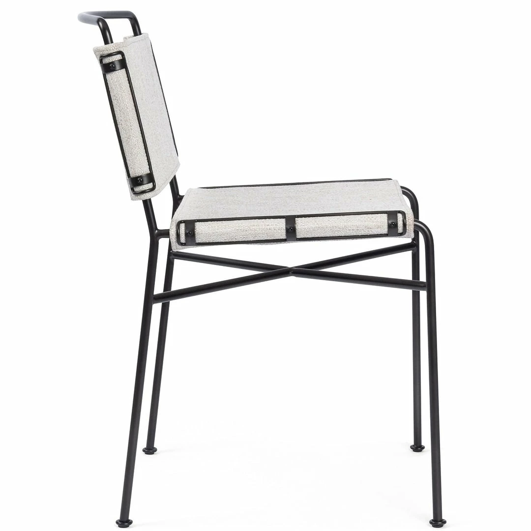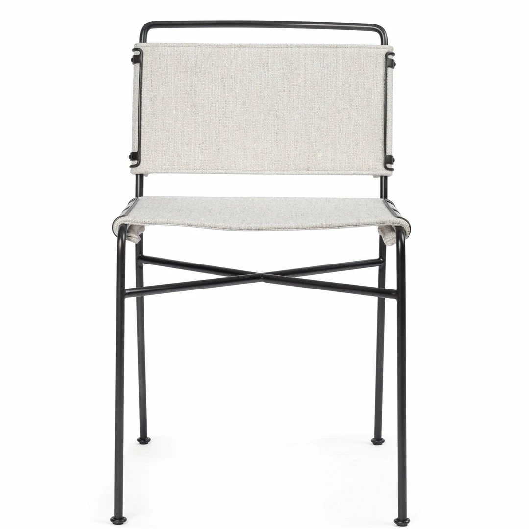 Designed for style and comfort alike, The Avant Natural Sling Dining Chair provides a point – counterpoint with mixed materials and contrasting hues. The black industrial inspired iron frame is softened with a sling style seat and back in tonal ivory and beige basket weave fabric.