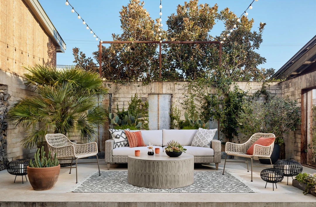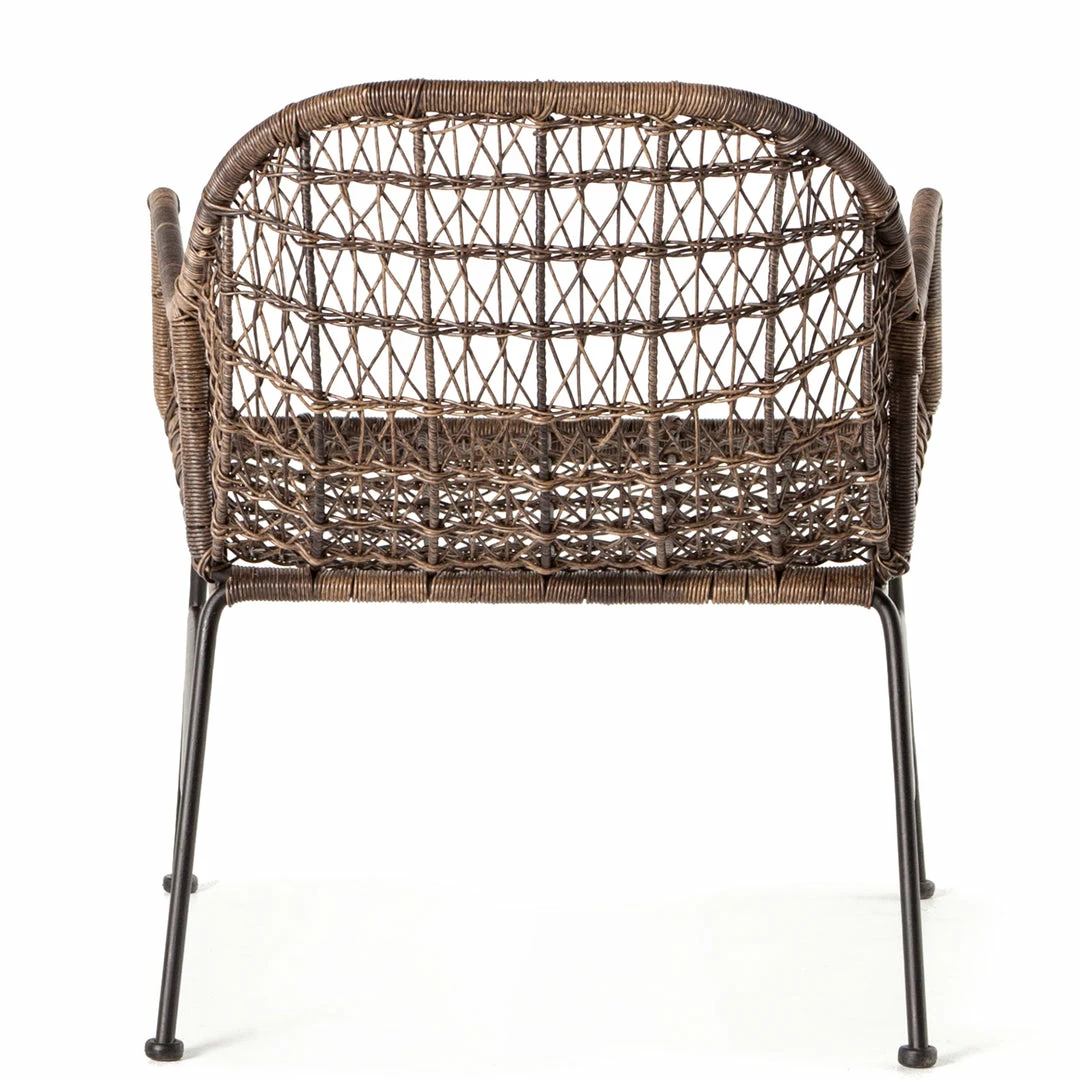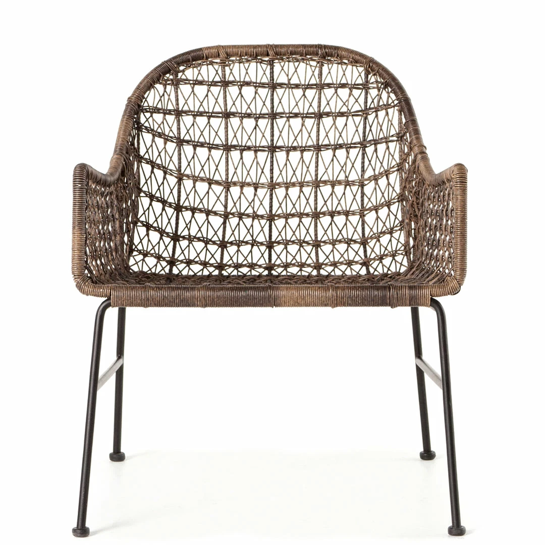 Clean, contemporary shaping and an updated weave transform all-weather wicker into something modern. This take on the club chair is supported by a contrasting iron base.