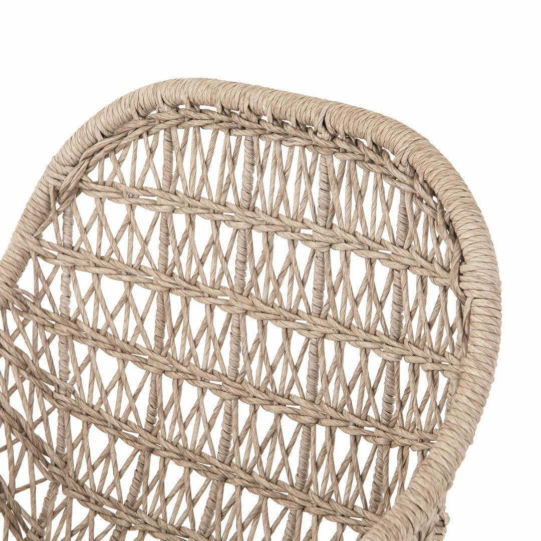 This low-armed woven synthetic wickerย counter chair features a molded and contoured seat forming a net-like style that will capture your love instantly. Supported by a contrasting black iron base, this organic modern dining stool works indoors or out.