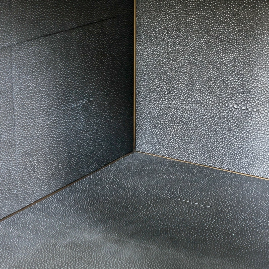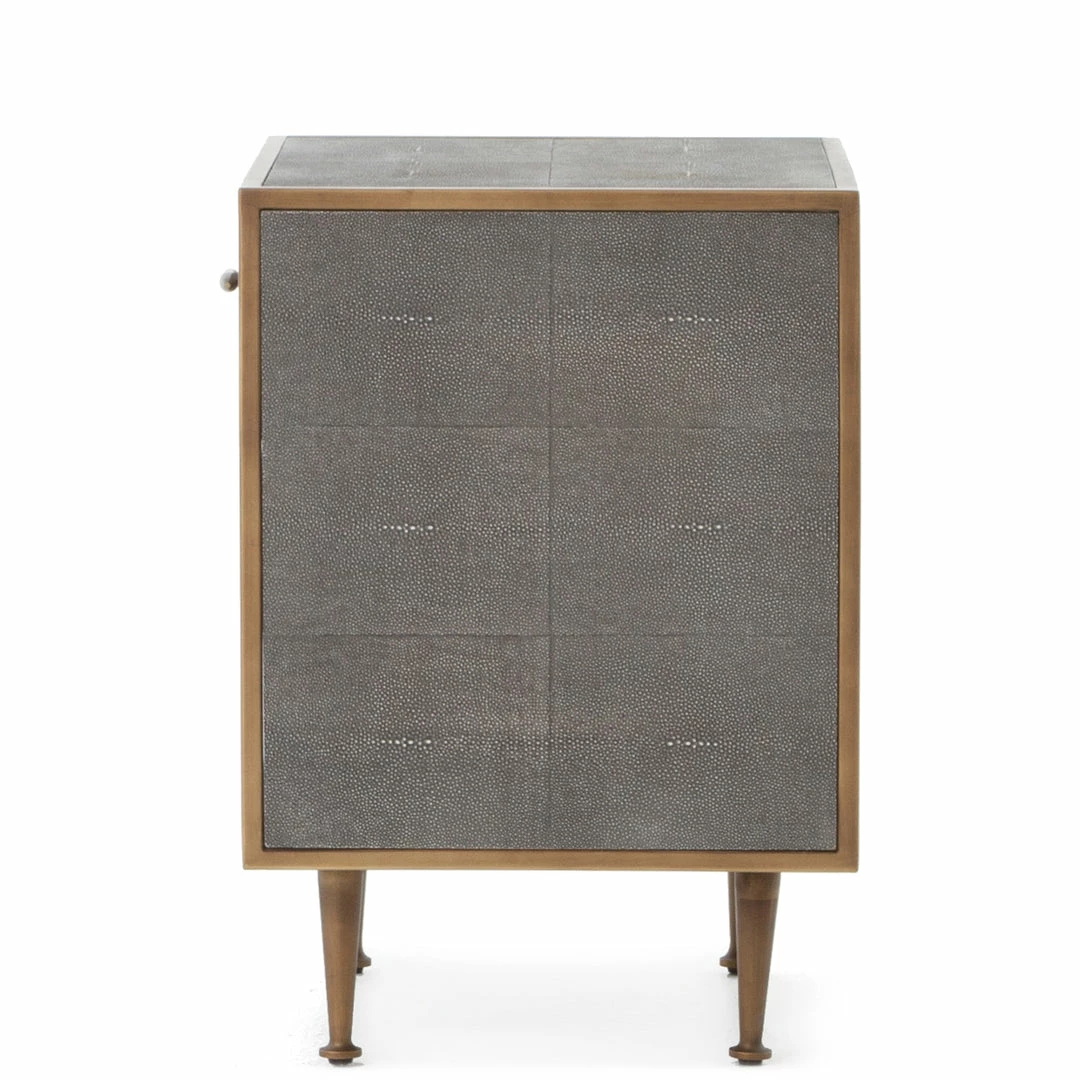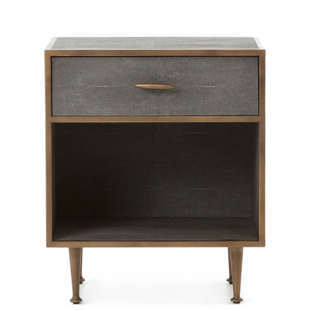 This mid-century modern one-drawer night stand is covered in gray resin faux shagreen and trimmed in antique brass for contrast. Set on tapered metal legs, Andel features an open shelf design to display your favorite books and accessories.