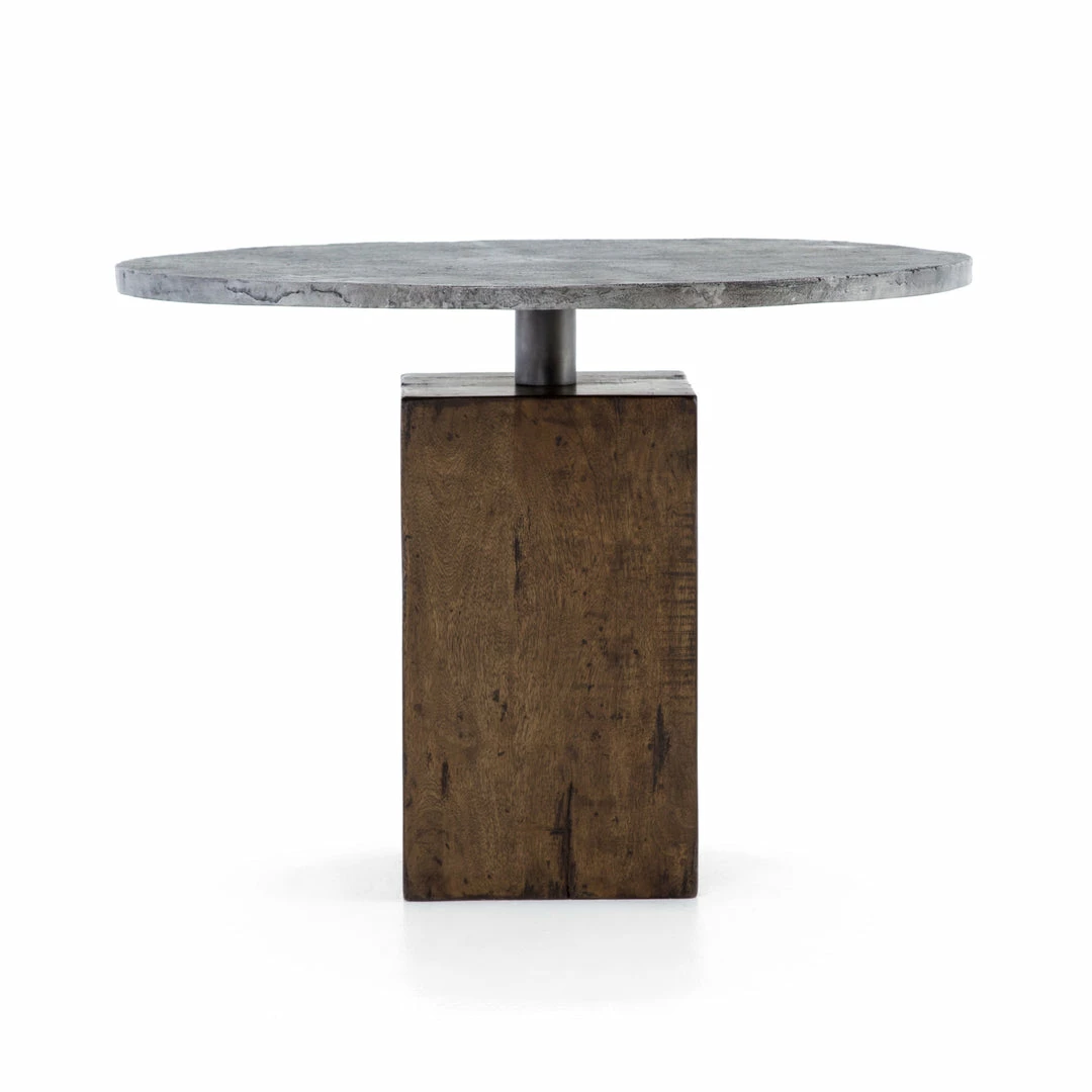 Shape and texture blend for instantaneous impact. A rectangular slab of weathered reclaimed woods provide a solid base to offset a slender aluminum neck before dramatically brimming into a round tabletop. Light gunmetal finish reveals industrial texture and metallic edge.