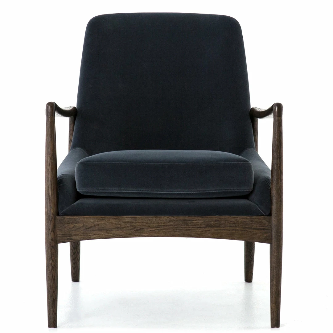 Dramatic arms and deep seat offer relaxation with mid-century modern sophistication. Sculpted cedar frame adds an architectural feel to soft velvet upholstery.