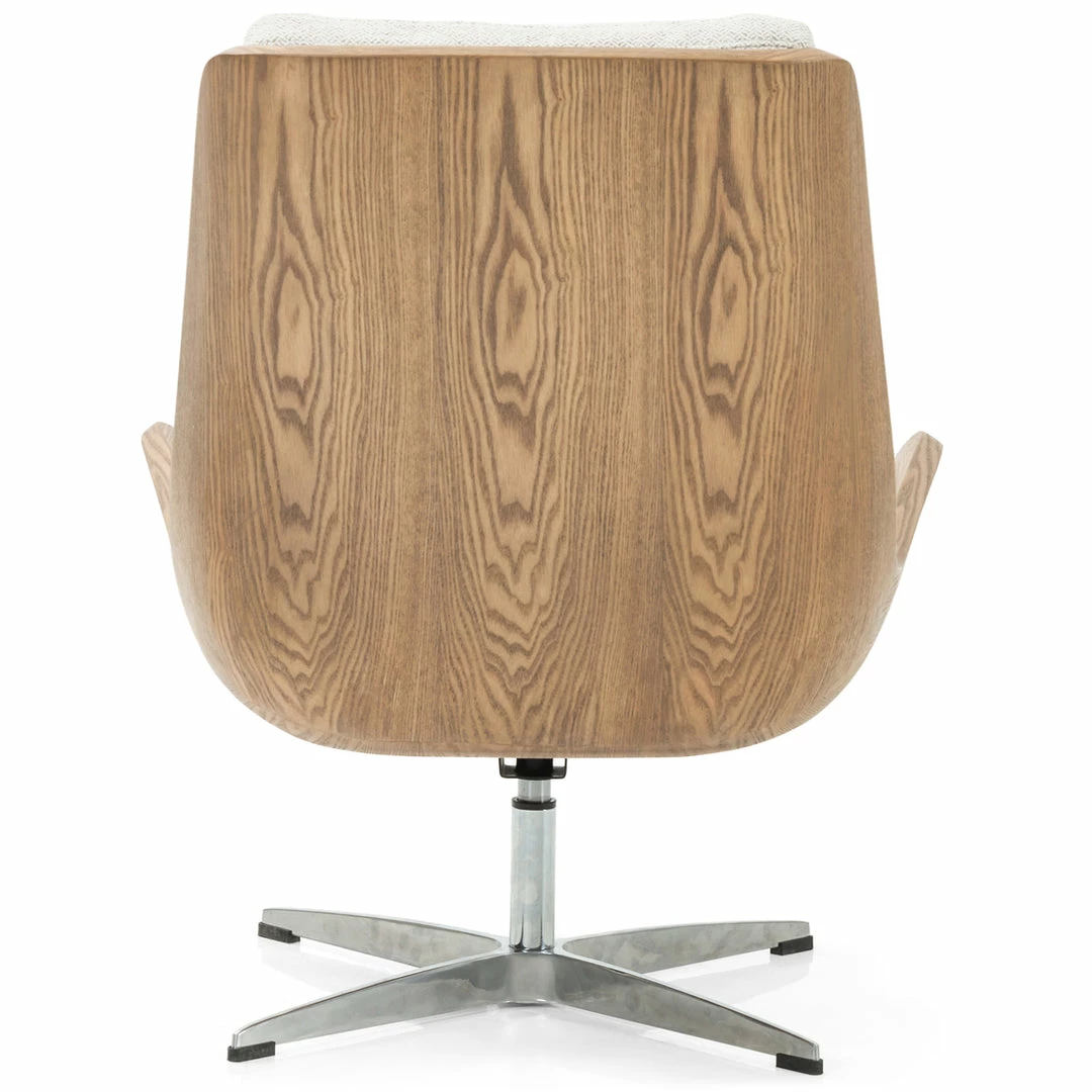Inspired by Mid-Century modern bentwood seating, this deep-pitched occasional chair features toasted ash casing, textural off-white upholstery and a pewter-finished steel swivel base.