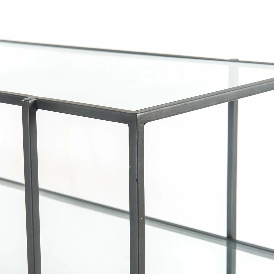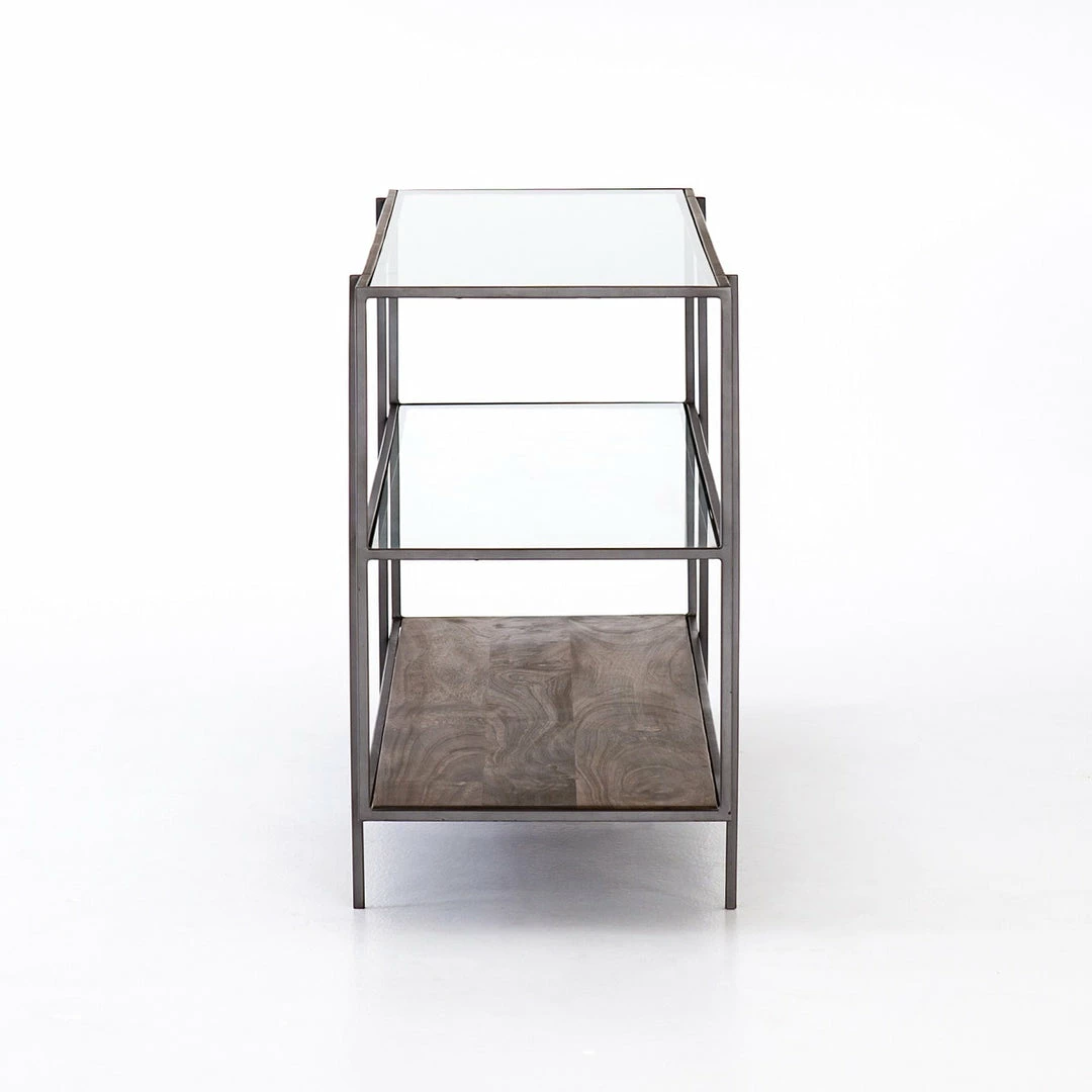 Mixed materials refashion simple design into something beautiful. Slim, Parsons-style iron framing supports three-tiered shelving of brown mango wood and clear tempered glass. Use in an entry, office, or as a media console or sofa table.