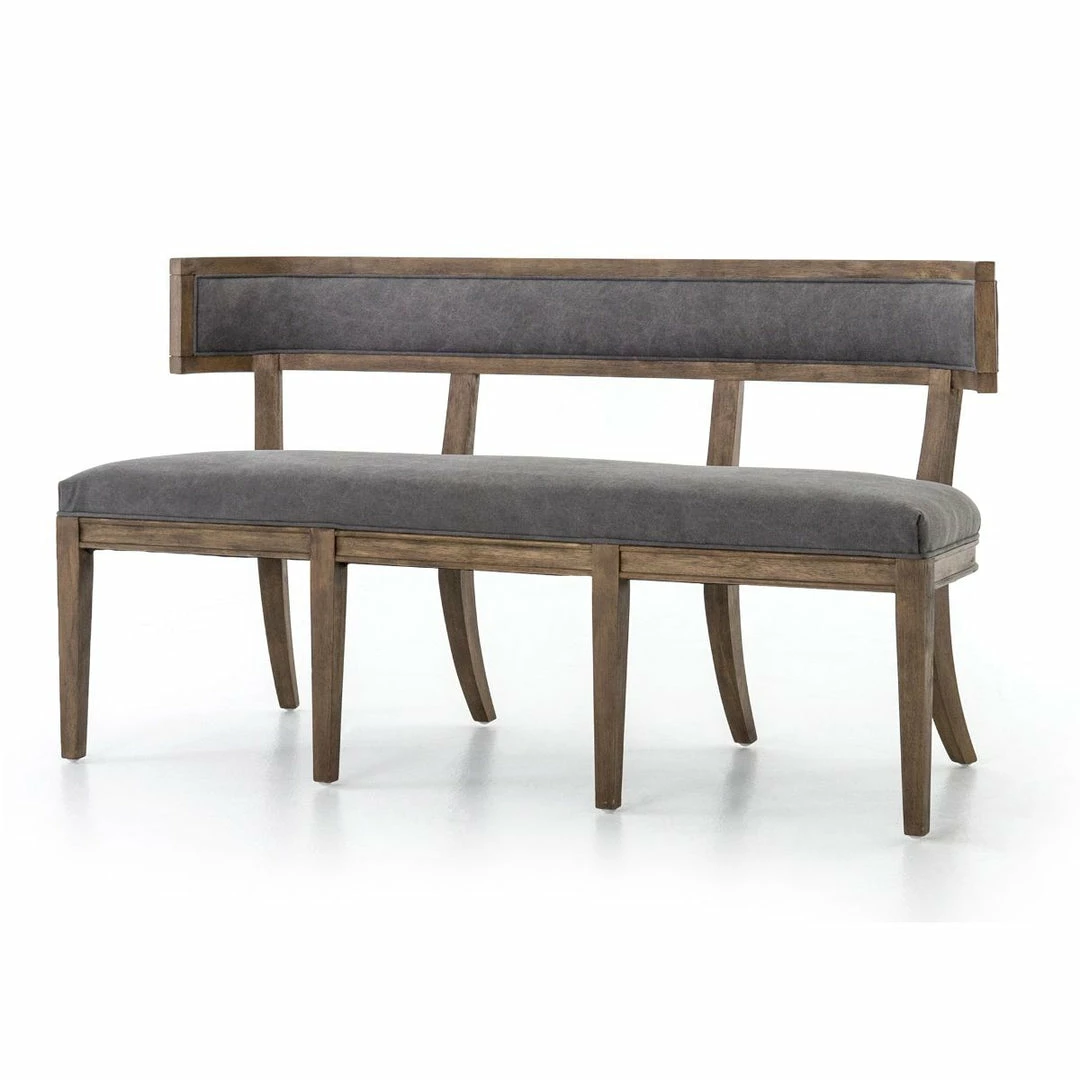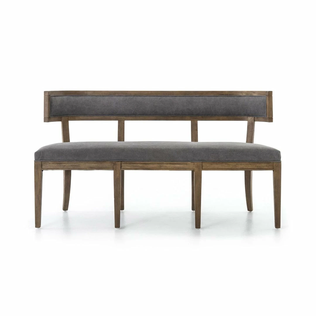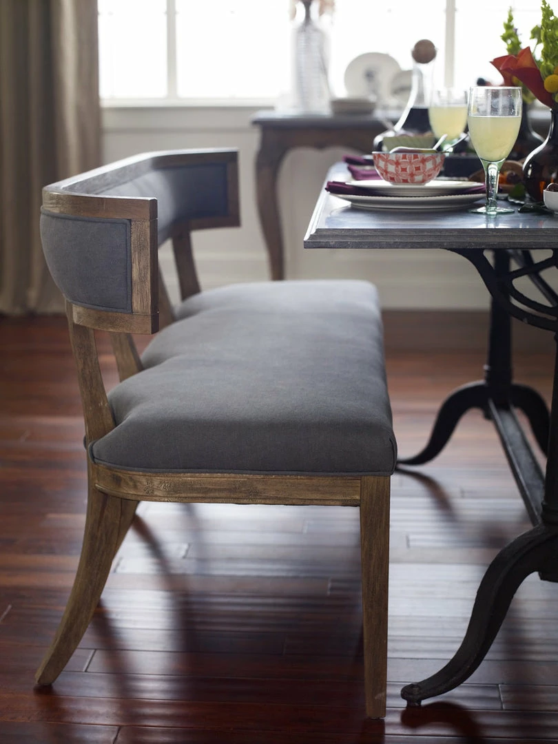 The Carter dining bench exudes Old World appeal that is a comfy choice featuring curved hardwoods, and soft gray upholstery.