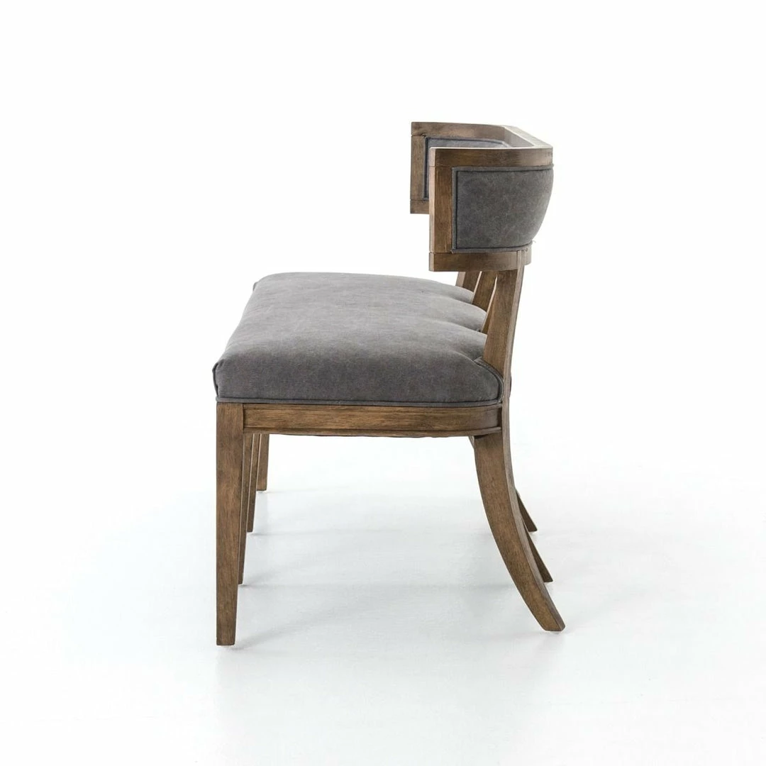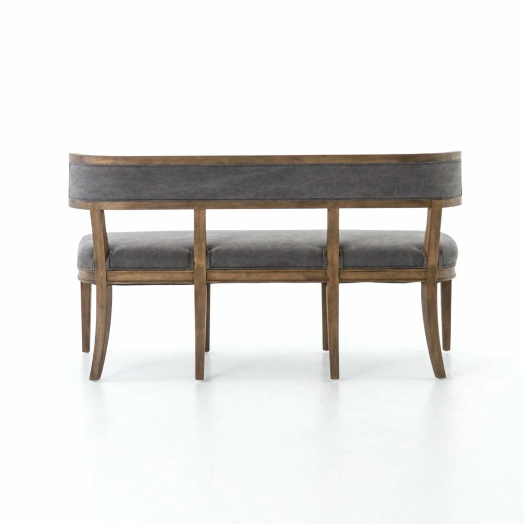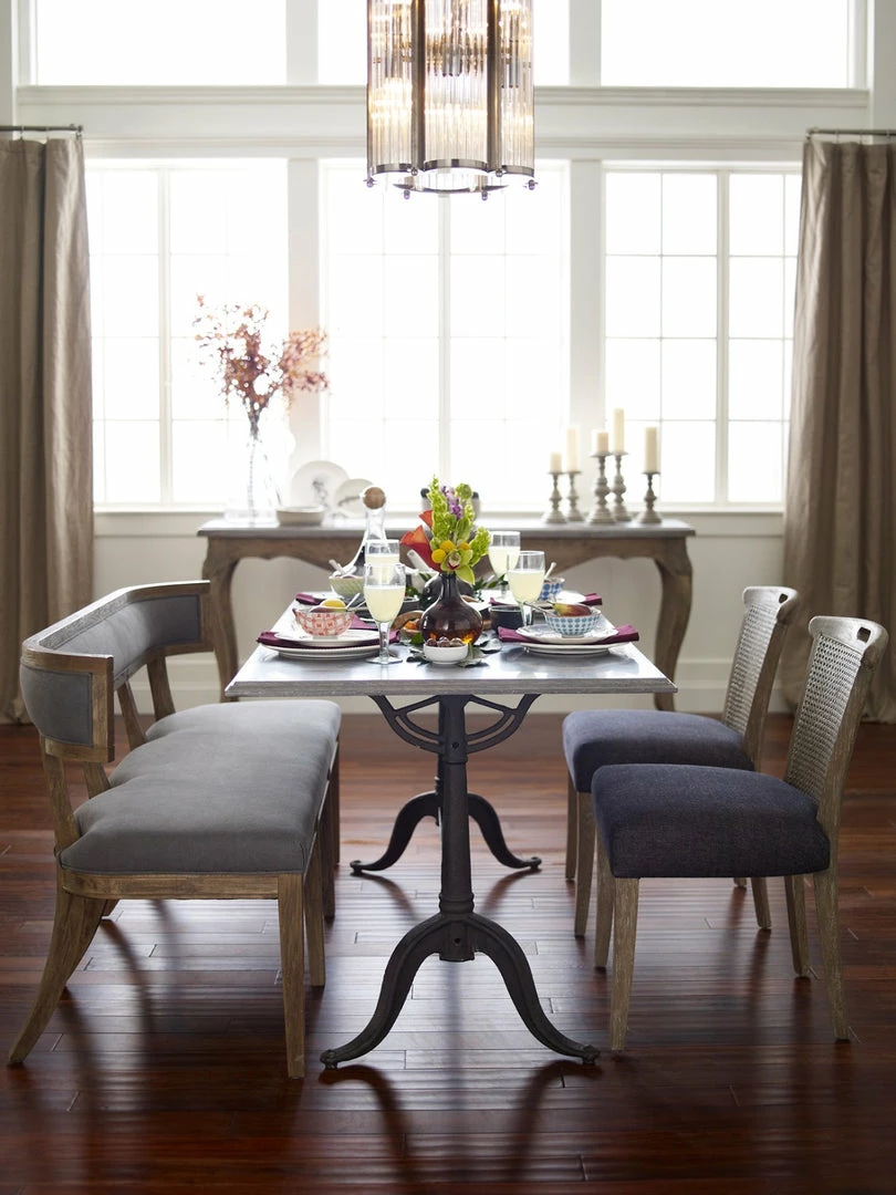 The Carter dining bench exudes Old World appeal that is a comfy choice featuring curved hardwoods, and soft gray upholstery.