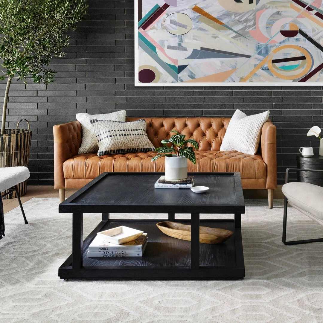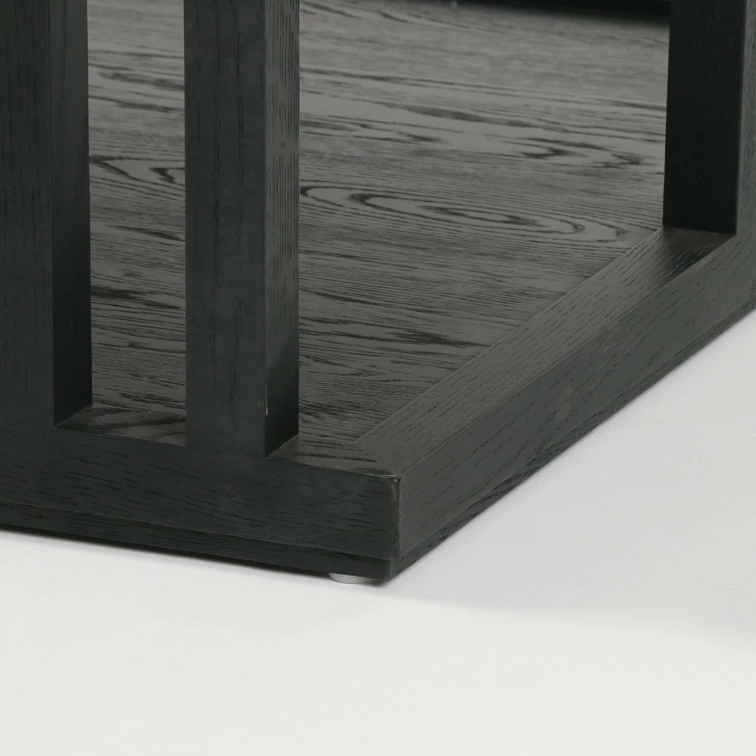 The living space centerpiece gets a geometric spin. Drifted black oak forms cleanly-mitered corners, offering two tiers of tabletop for plenty of space. Open-air styling lends a look of lightness to rustic materials.
