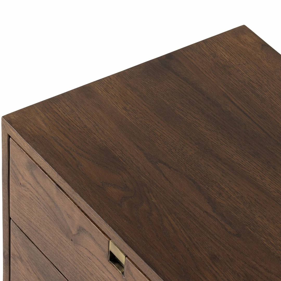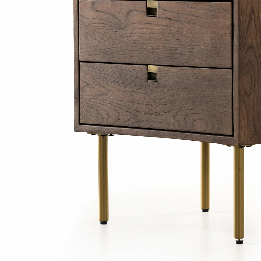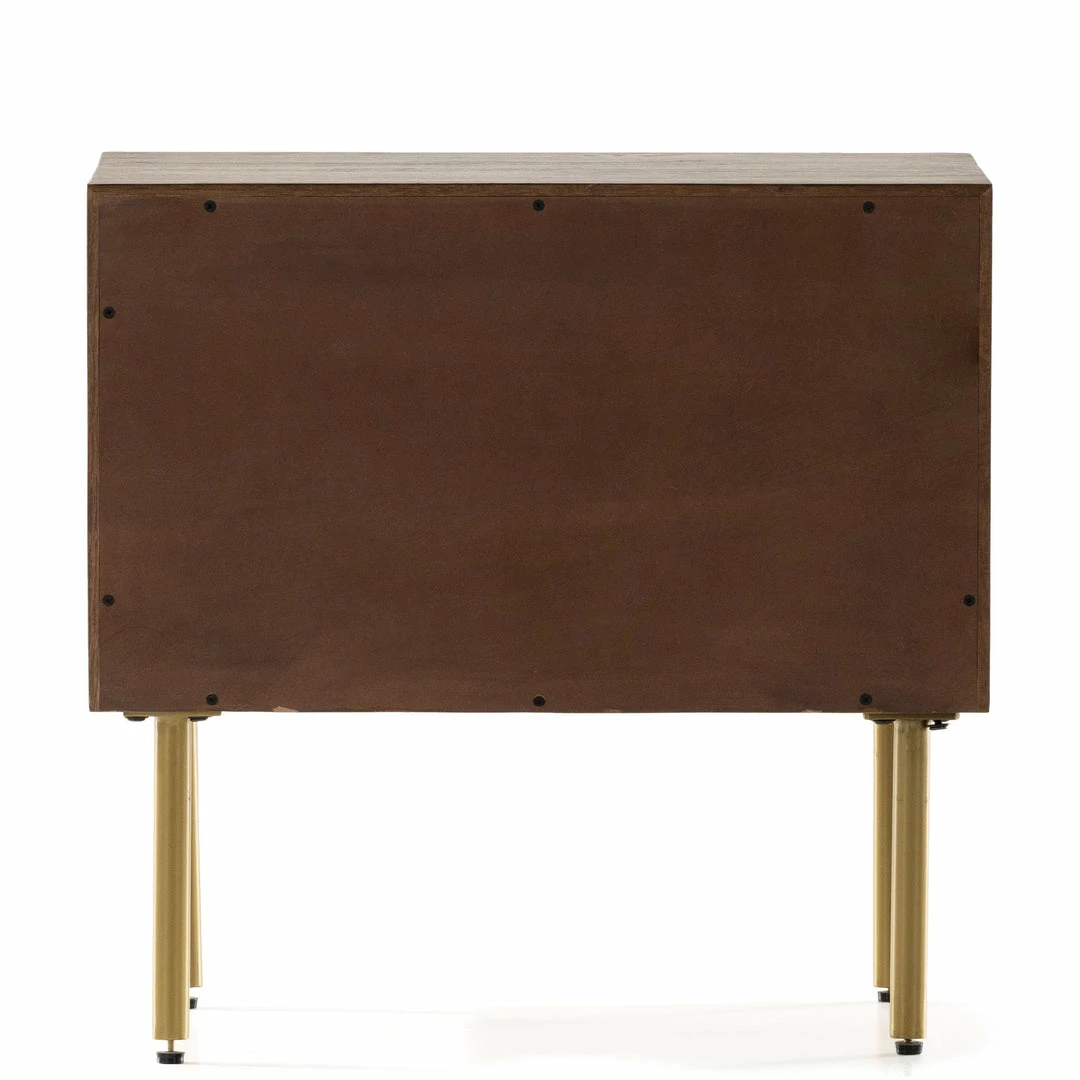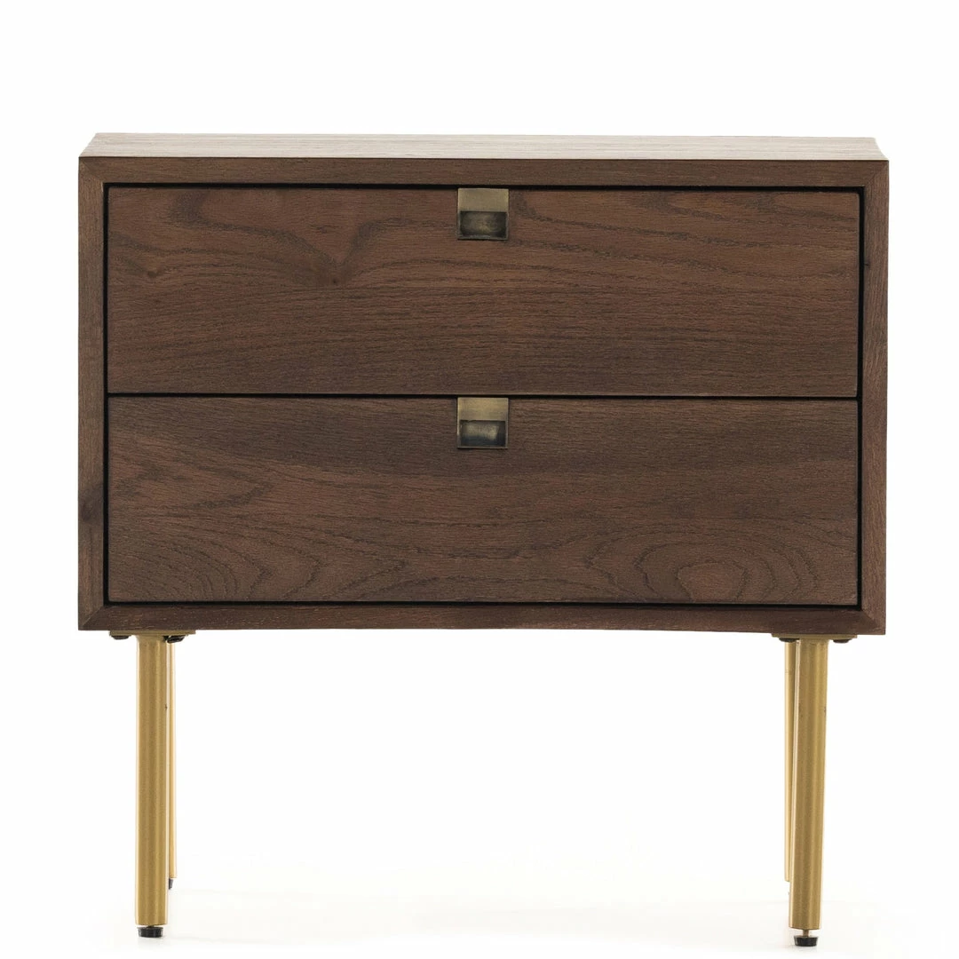 Style meets simplicity in this Danish-inspired design. Solid oak in a rich umber brown welcome squared iron hardware in a satin brass finish , while the dual drawers offer plenty of storage for your bedside essentials.