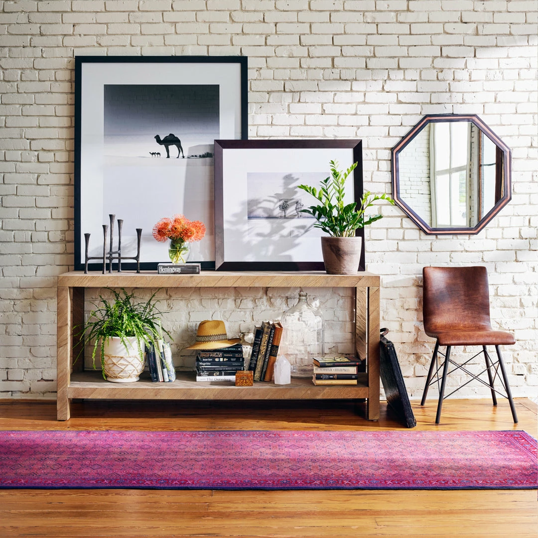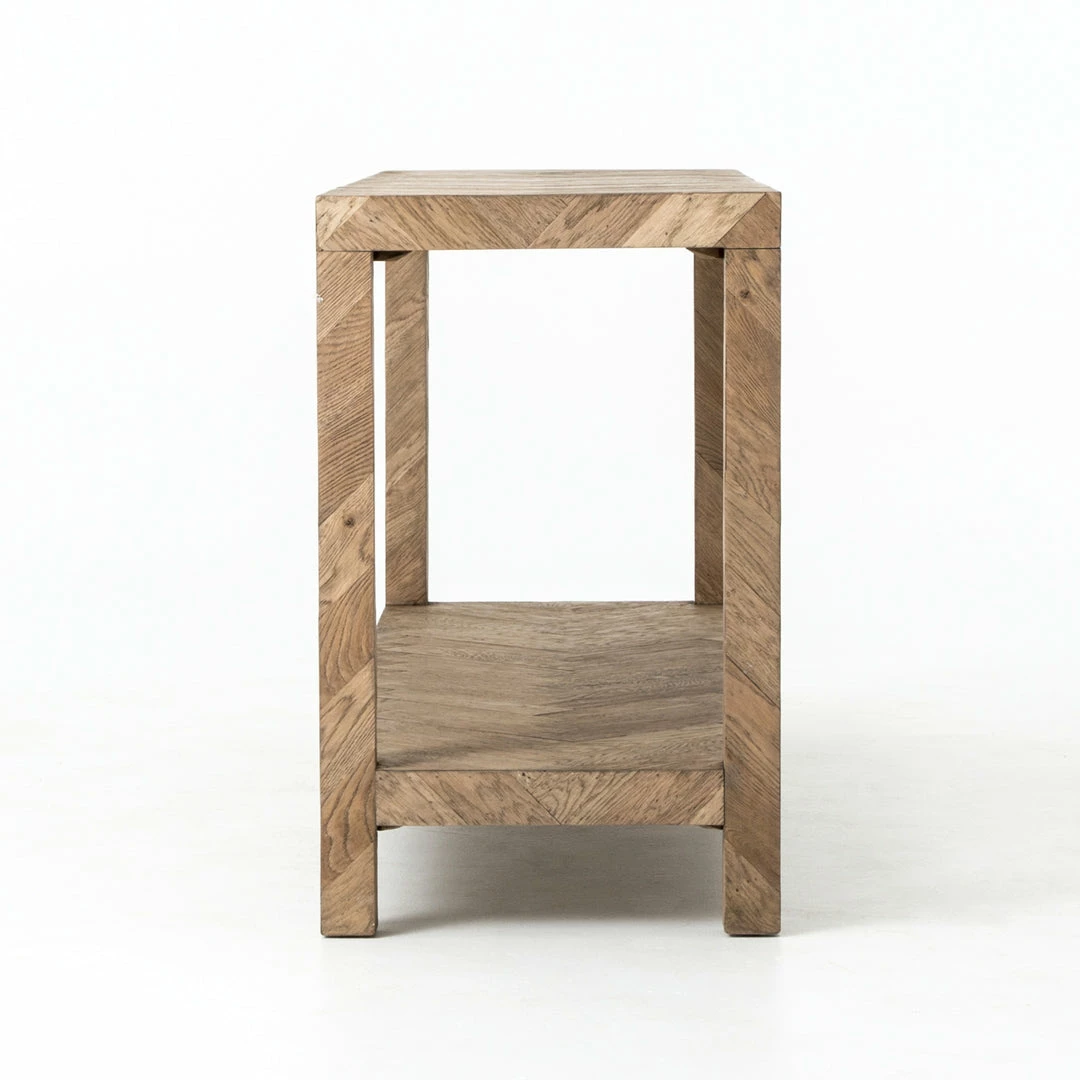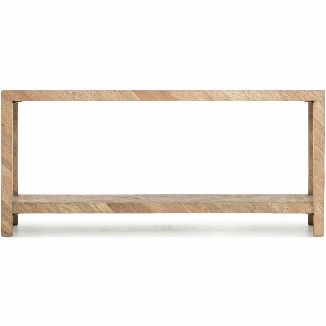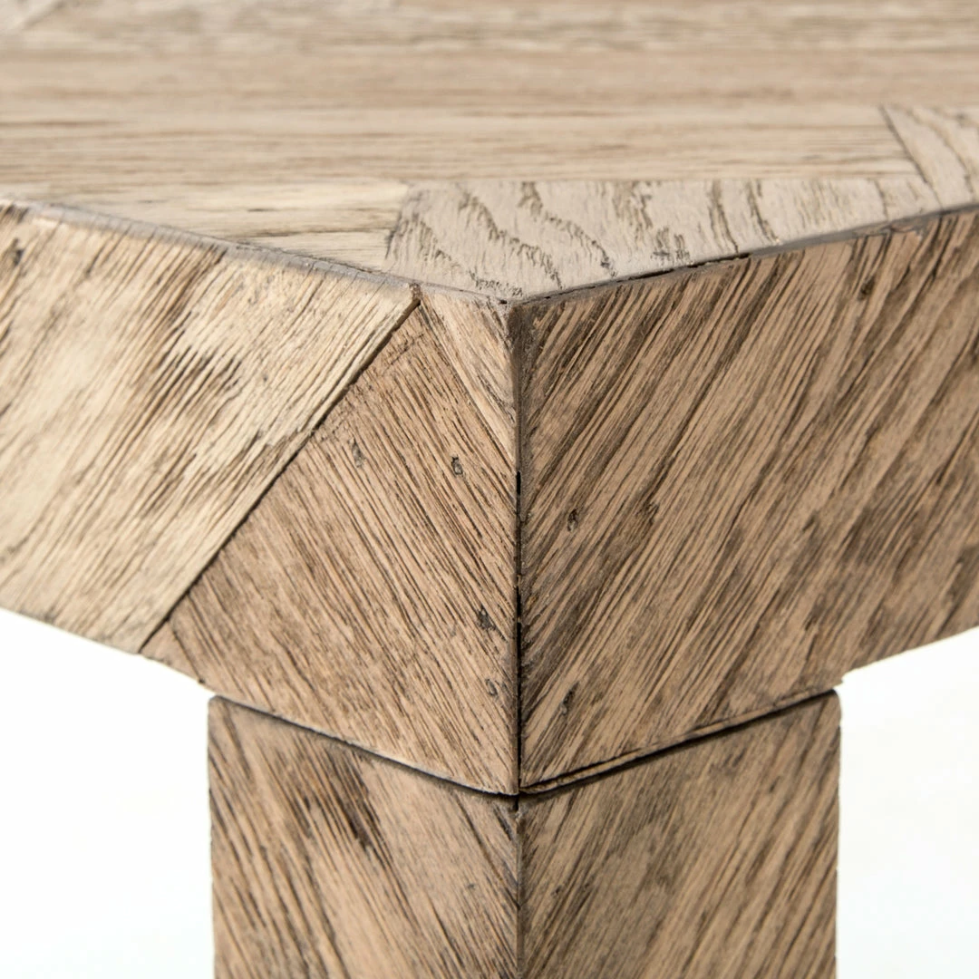 The simplest answer is often the right one. This deceptively simple Parsons-style table offers grandly exaggerated dimensions and a subtle, herringbone parquet pattern on every surface.