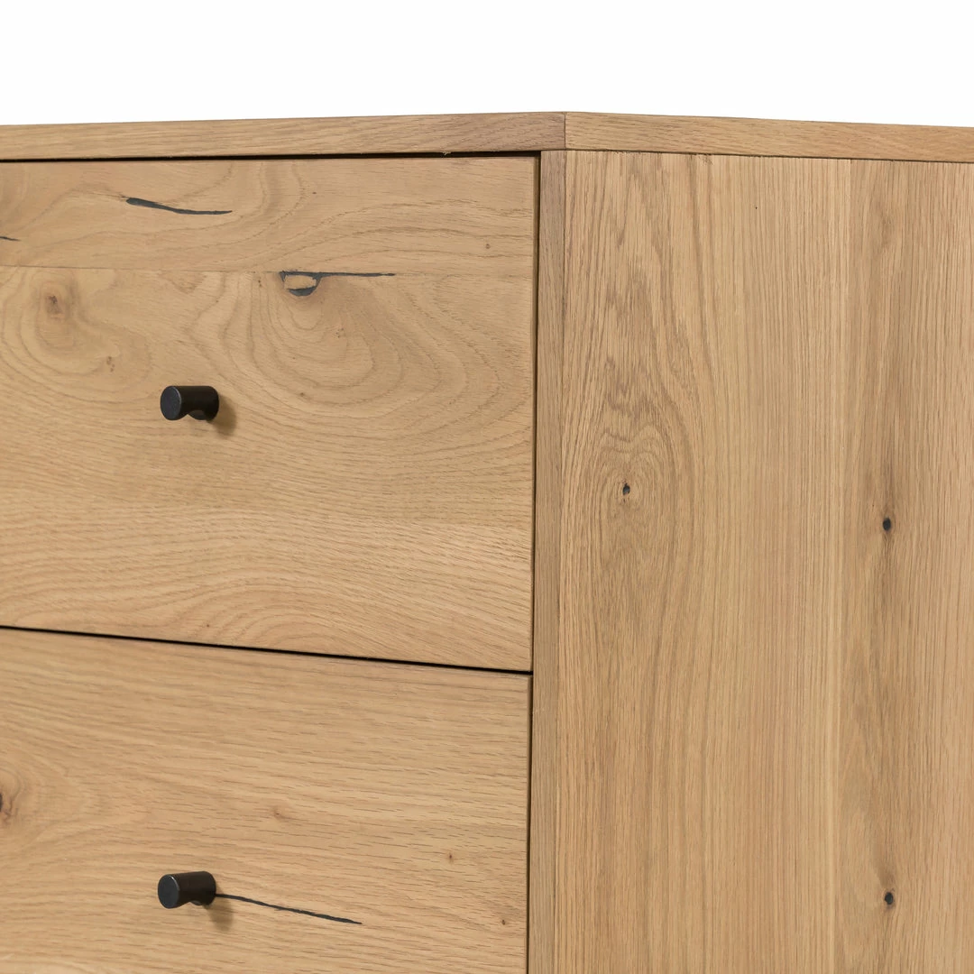 Clean and streamlined. Light-finished oak features five spacious drawers plus gunmetal-finished hardware, for a crisp look that’s always in style. Dark resin plays up natural graining for texture and authenticity.