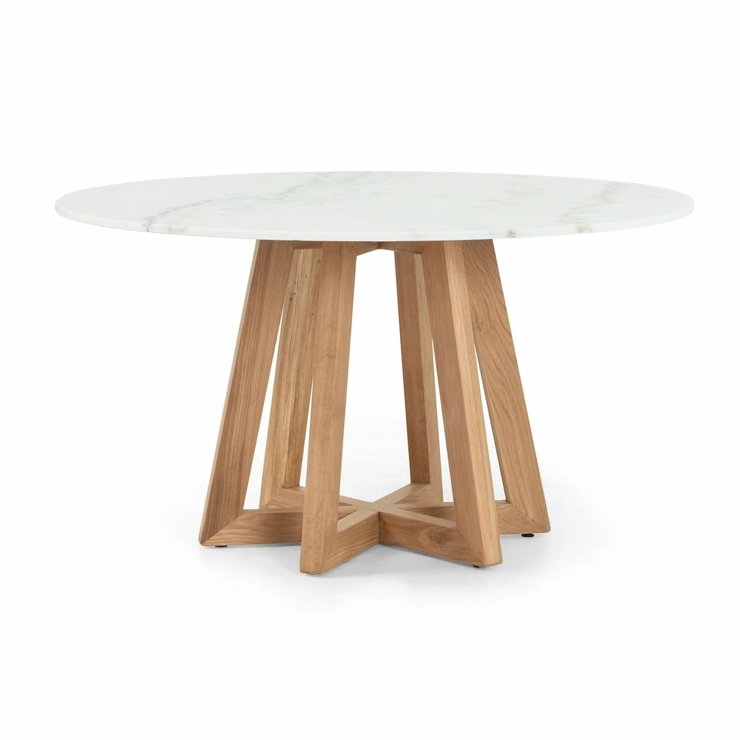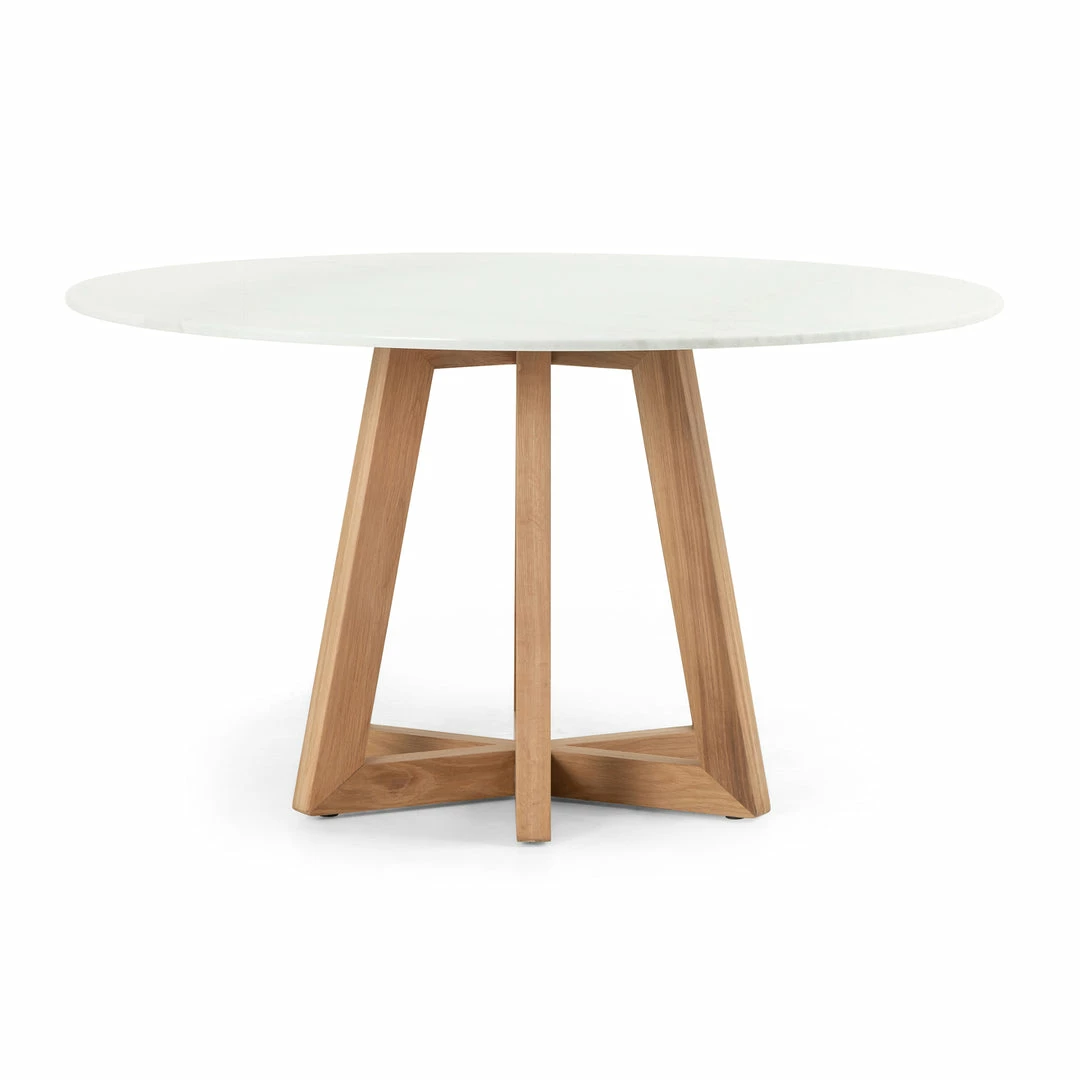 Scandinavian design aesthetic gives a beautifully fresh take on modern farmhouse style. An open, angular base of light honey-finished oak supports a rounded tabletop of white marble, for a clean, versatile look great for everyday dining.