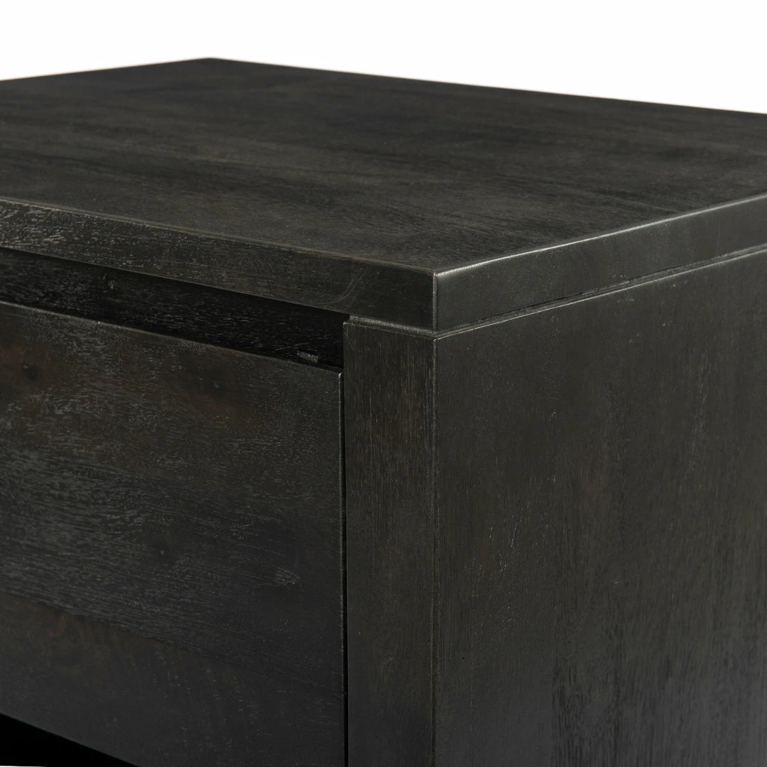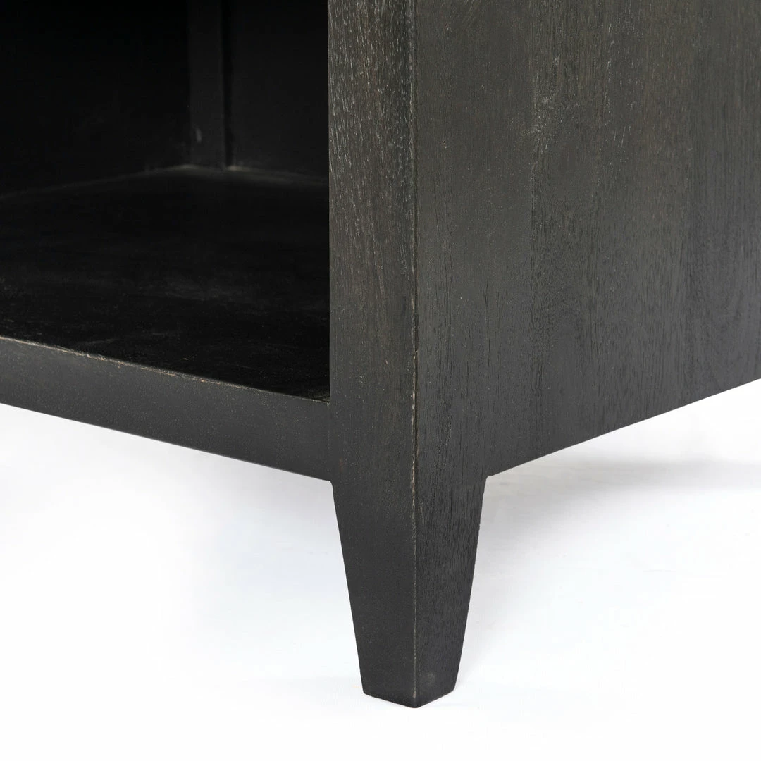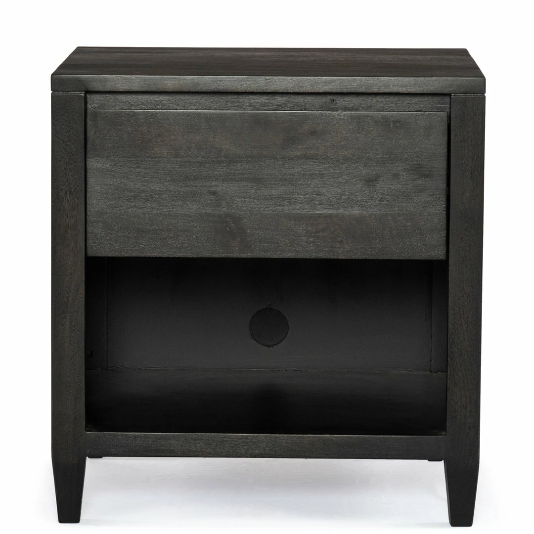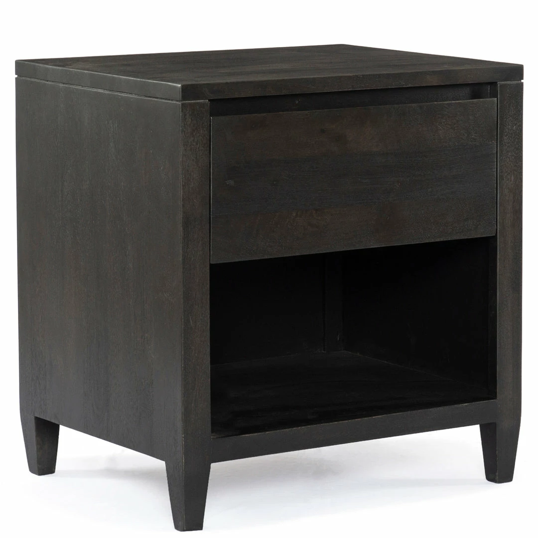 Modern minimalist, refined. Made from solid black-finished mango, a simply shaped nightstand offers a single drawer and open shelving for handy bedside storage, plus tapered legs for a shapely finishing touch.