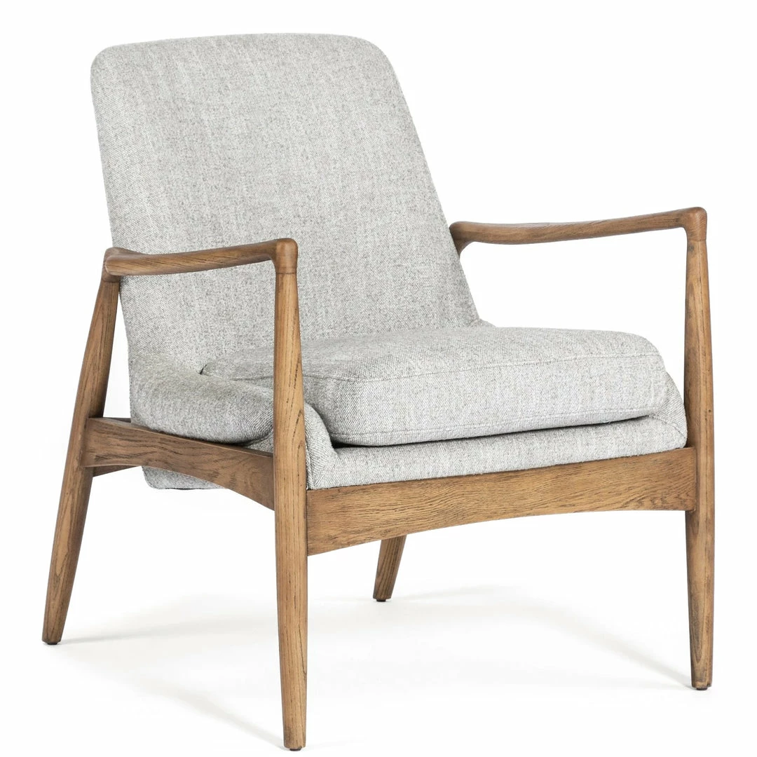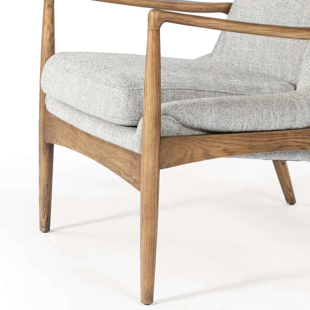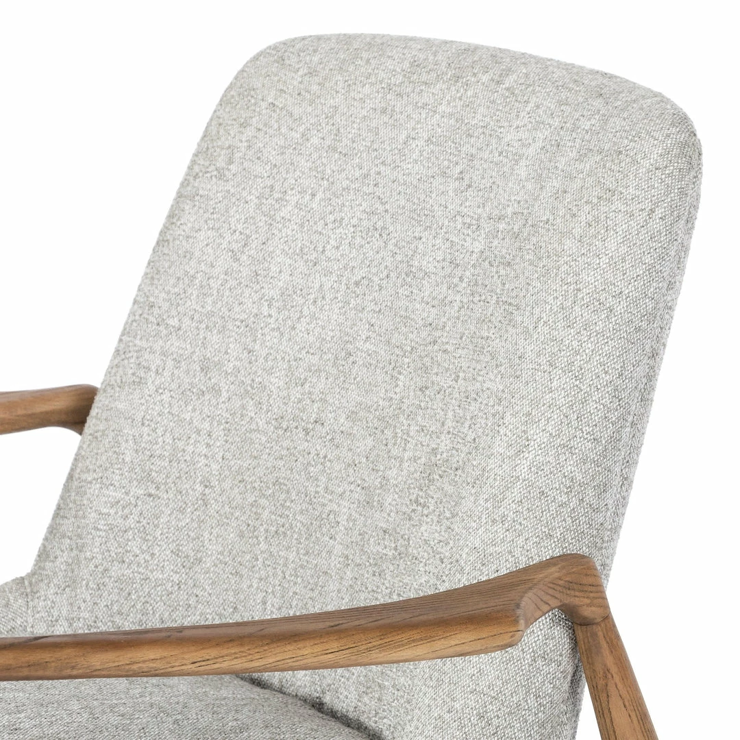 Dramatic arms and a deeper seat offer relaxation with mid-century modern sophistication. Sculpted framing of toasted nettlewood adds an architectural feel to soft-but-textural upholstery in a neutral light grey.