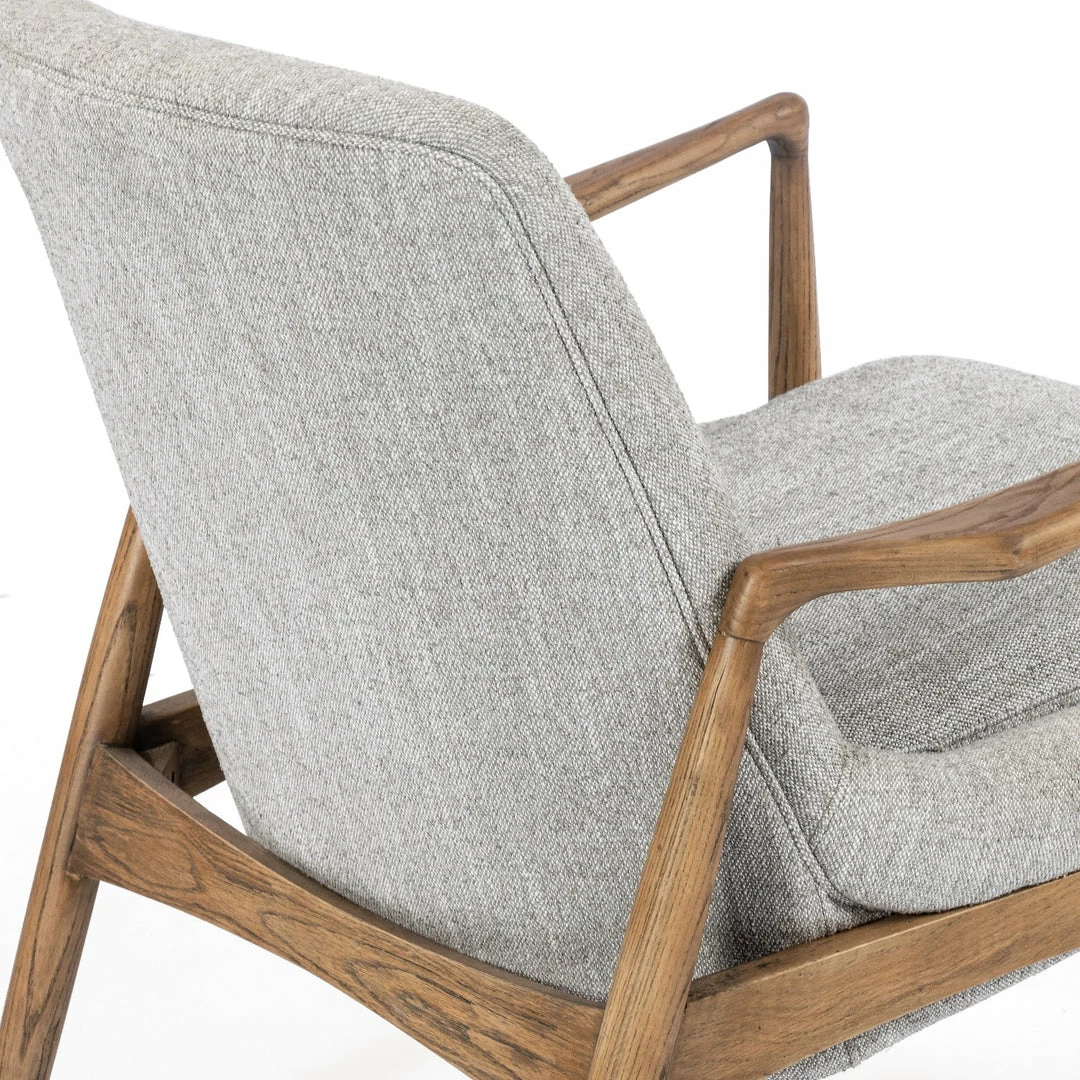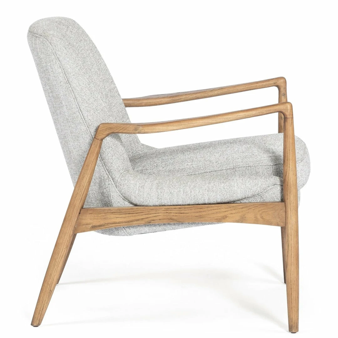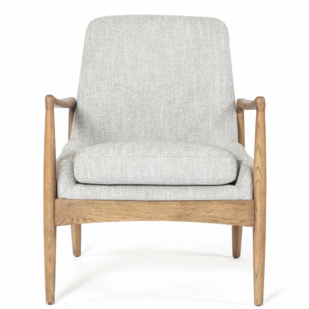 Dramatic arms and a deeper seat offer relaxation with mid-century modern sophistication. Sculpted framing of toasted nettlewood adds an architectural feel to soft-but-textural upholstery in a neutral light grey.