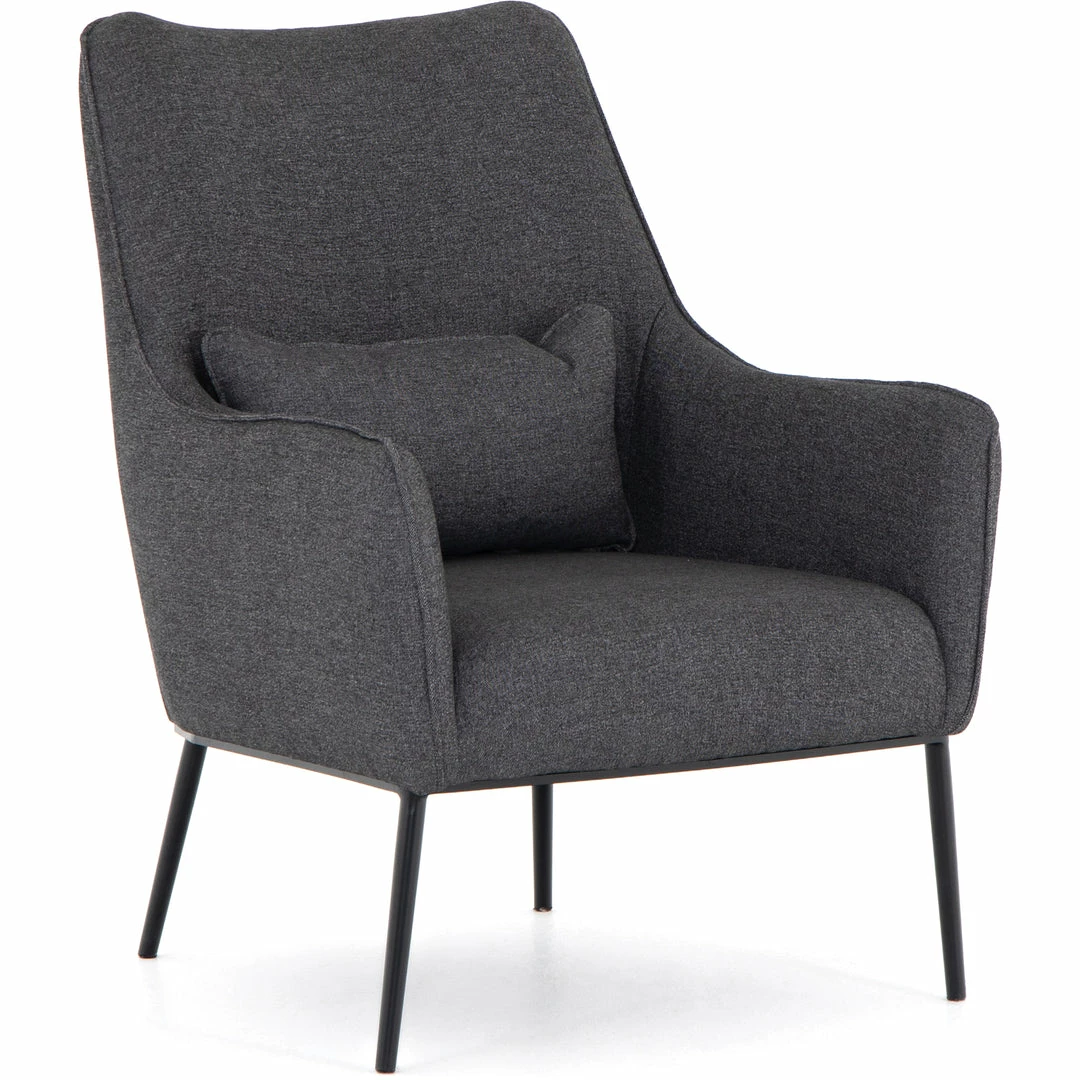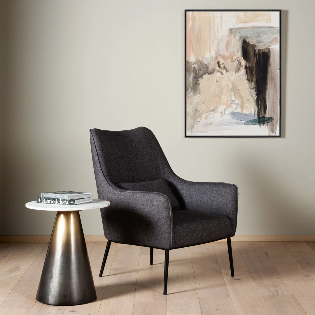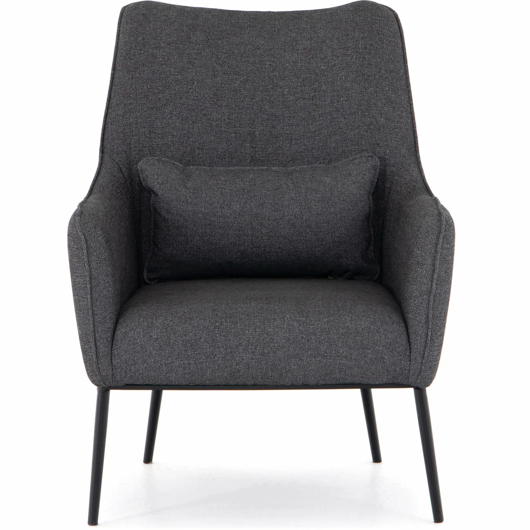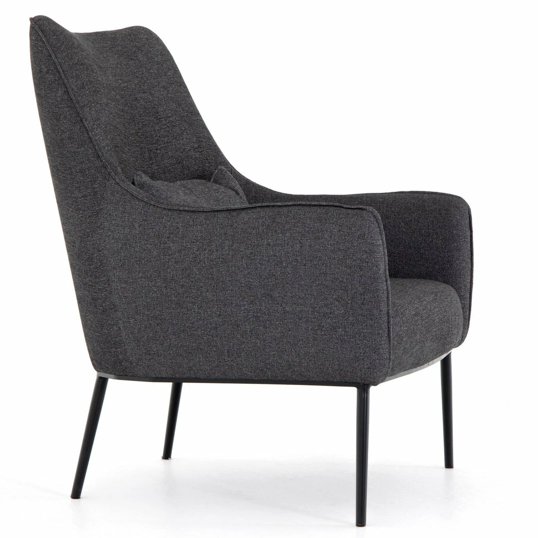 A modern take on the traditional wing chair, Cortez is tailored for comfort with black, menswear-inspired upholstery and perimeter piping for a crisp, clean look. Slim, black-finished iron legs keep things looking airy and light.