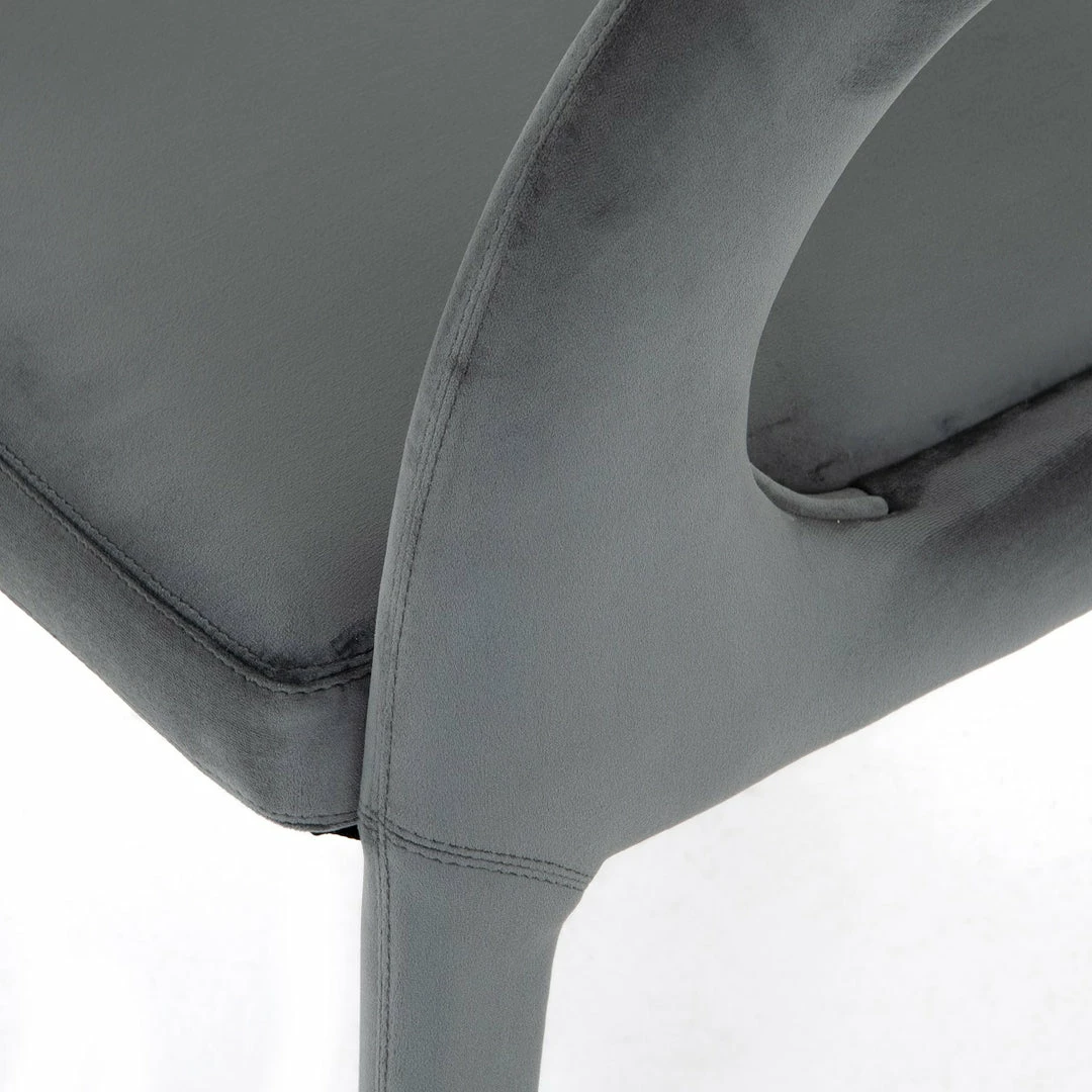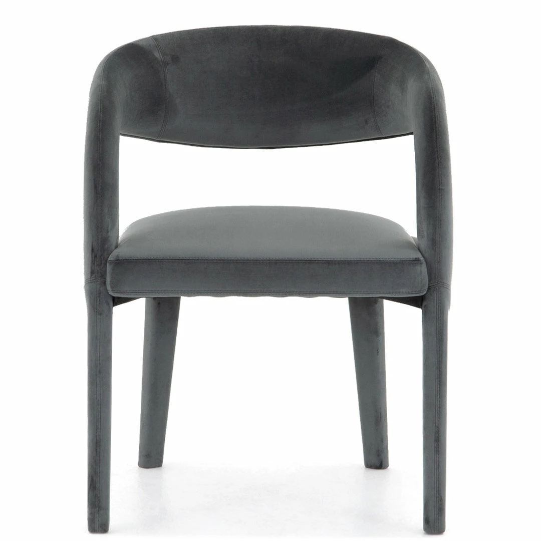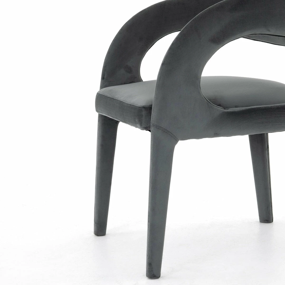 Well curved and finely sculpted, the velvety charcoal-upholstered seating makes for a unique and shapely addition to a modern dining room.