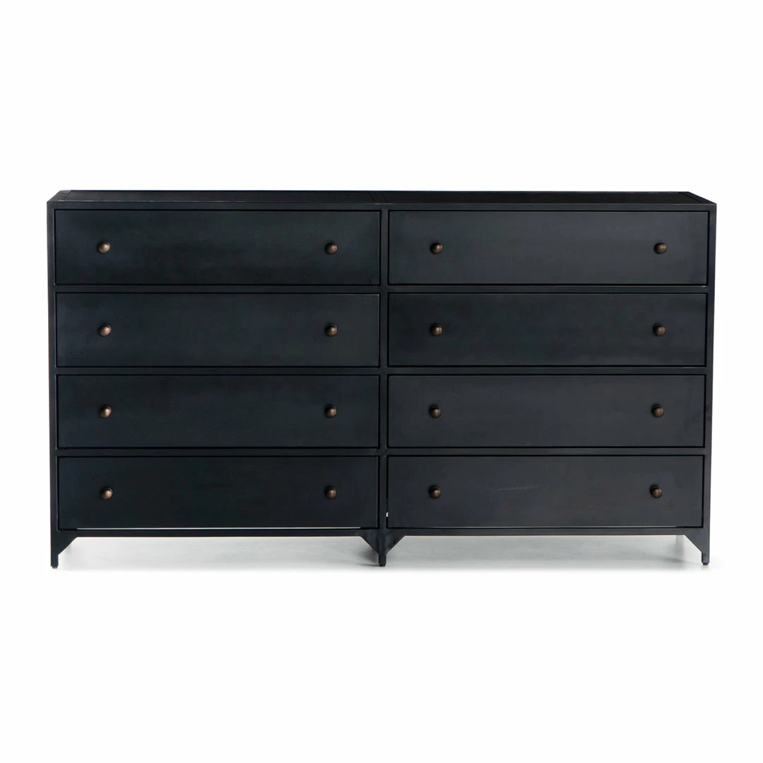 Industrial black iron forms this spacious eight-drawer dresser with and brass knobs for cool contrast.