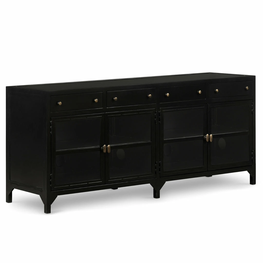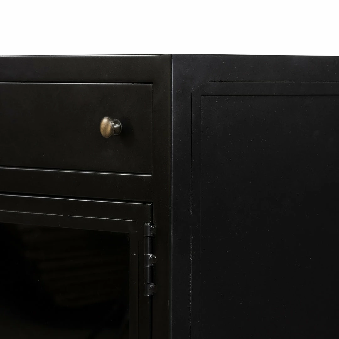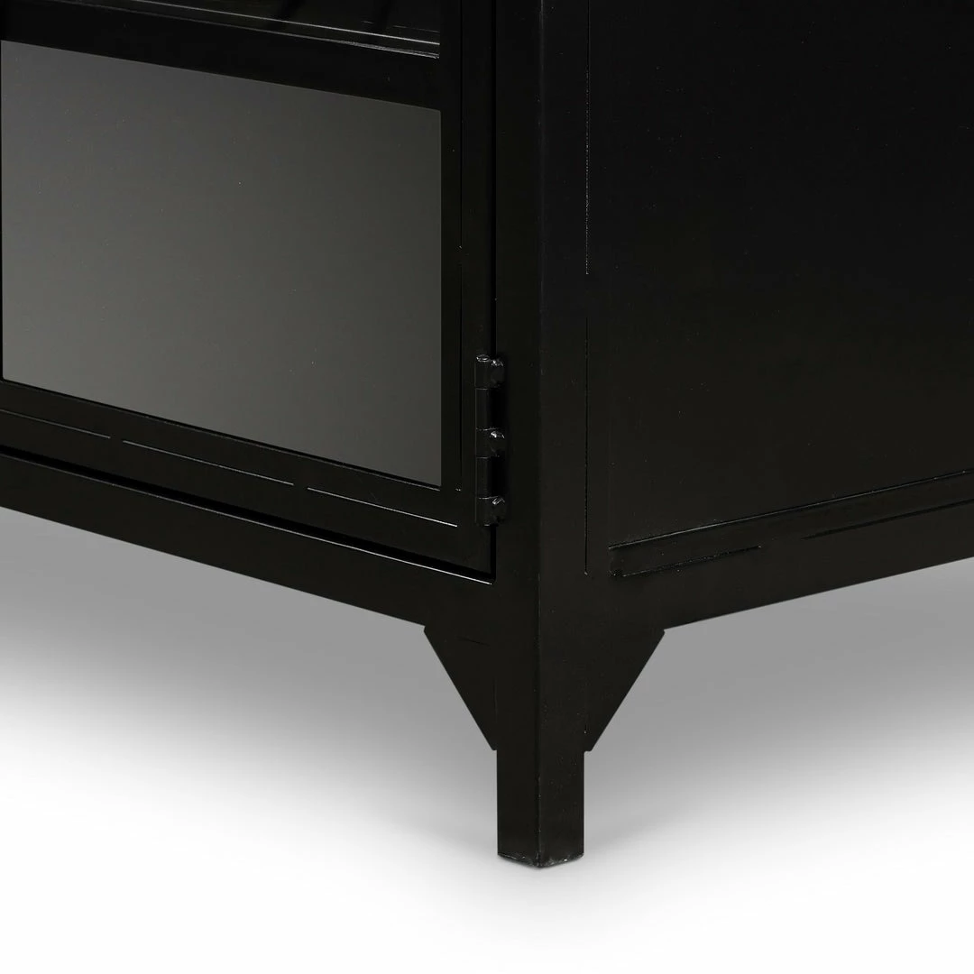 Black iron with glass door fronts and brass knobs form this industrial console. Use for media storage or to display your prized collectables.