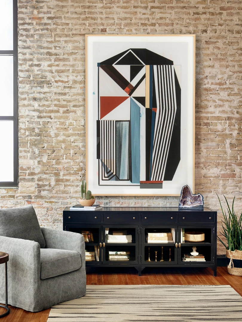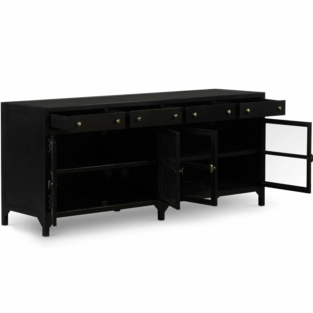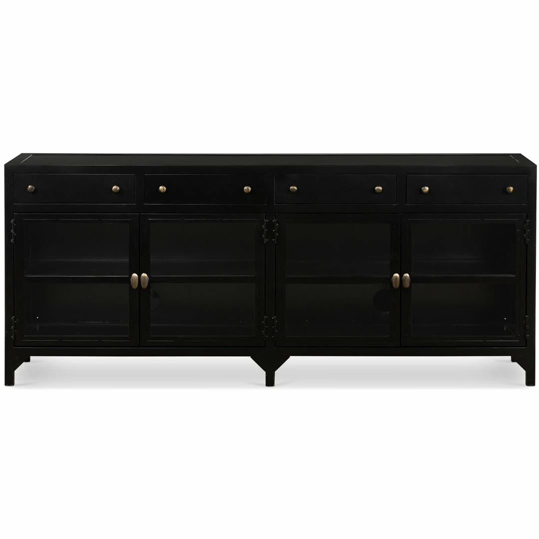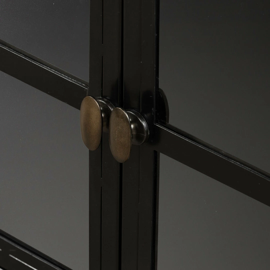 Black iron with glass door fronts and brass knobs form this industrial console. Use for media storage or to display your prized collectables.