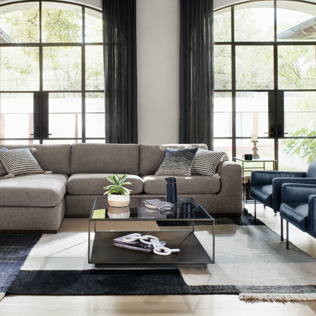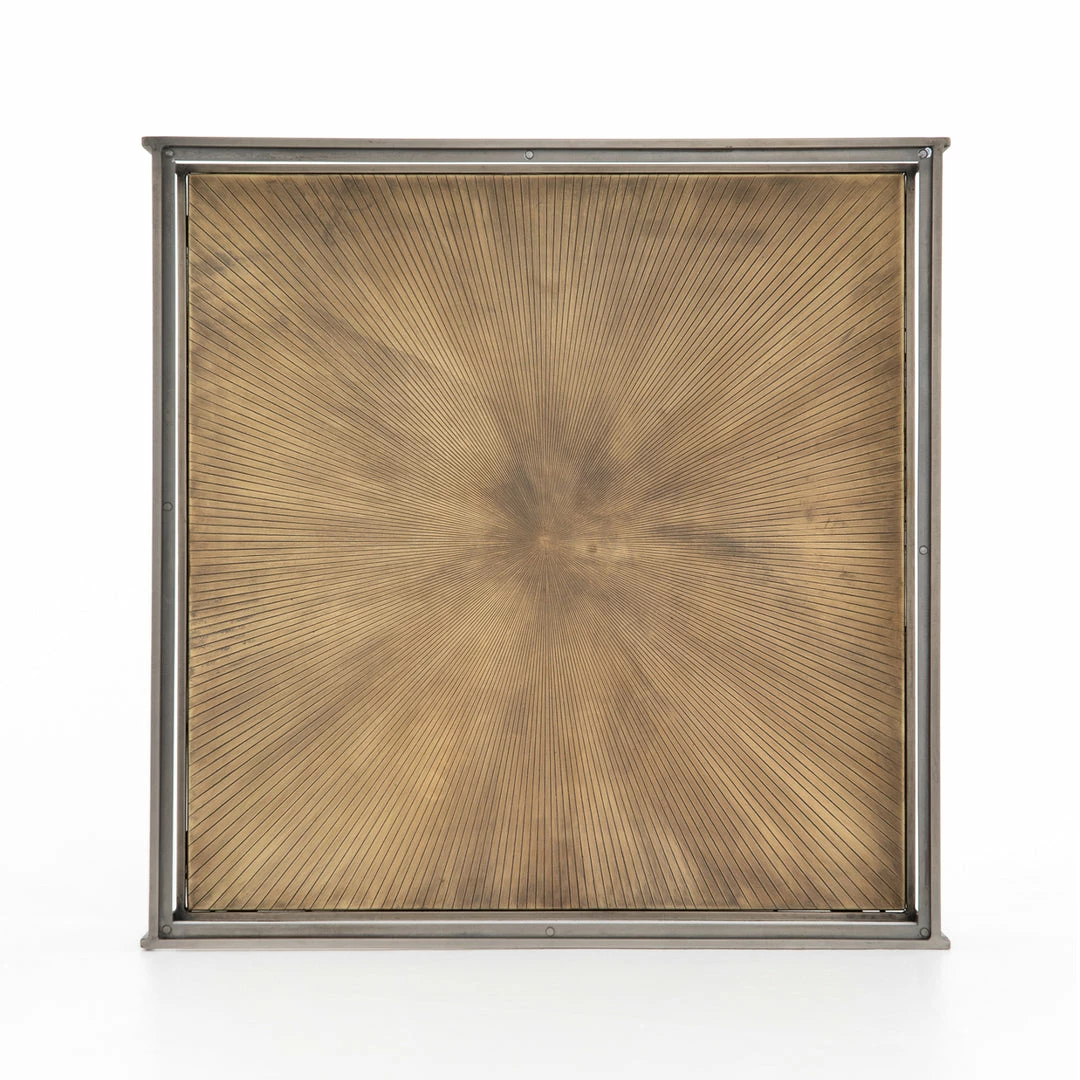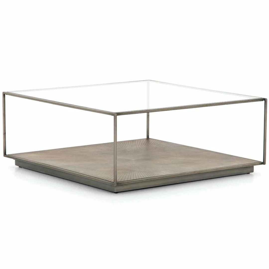 A shadowbox-style coffee table clears the way for your inner collector. Display dΓ©cor and prized possessions within a glass enclosure of antique nickel-finished iron framing and brass lower shelf with an eye-catching etched sunburst pattern.