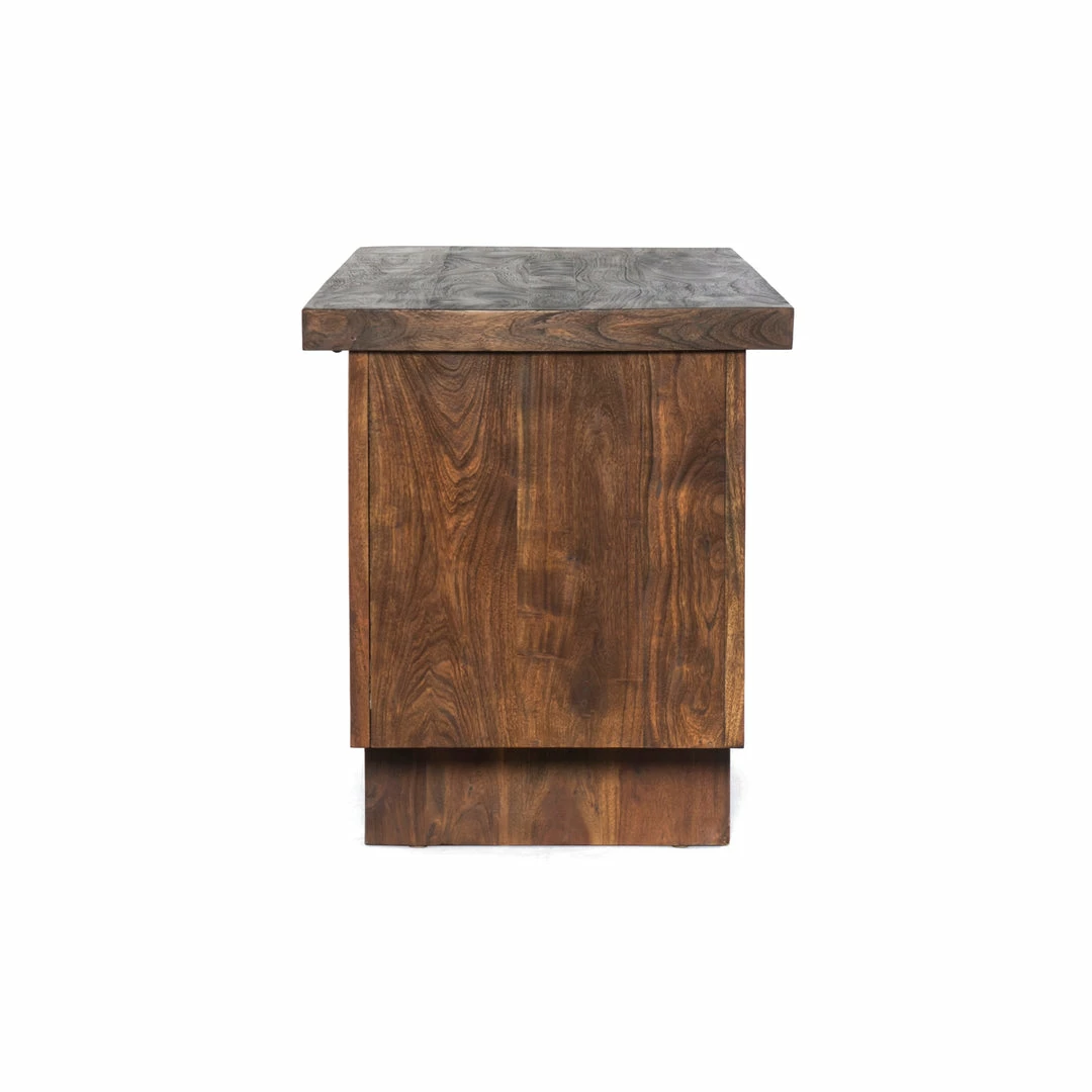 Mid-century inspiration at its finest. Chunky, inset legs of toasted acacia ground a linear desk featuring natural cane door fronts, for a fresh, textural twist. A removable faux locking key reimagines traditional hardware into something entirely novel. Three spare keys included.