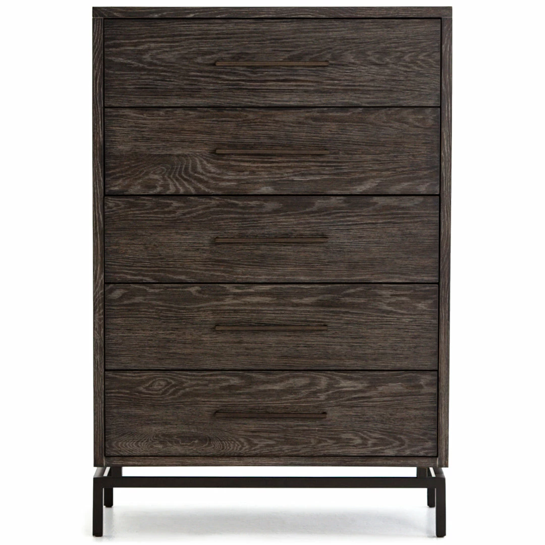 The Gram Dresser features a floating iron base that lightens the natural depth of the grey-finished oak. Clean lines lend a tailored look to warm rustic tones, while five spacious drawers bring plenty of storage options to the modernized bedroom.