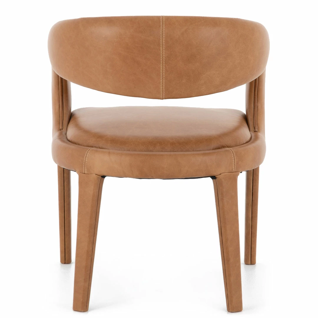 Well curved and finely sculpted, the butterscotch tan colored top-grain leather makes for a unique and shapely addition to a modern dining room.