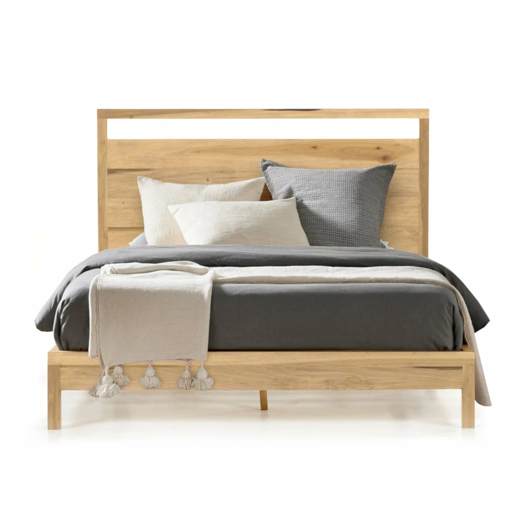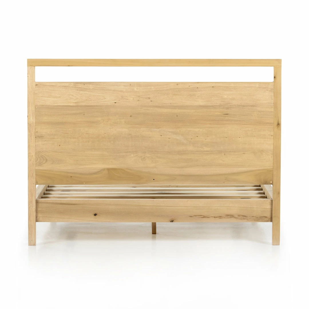 Dry-washed poplar forms a simple Shaker-inspired bed, with a horizontal cutout for a light, linear look.