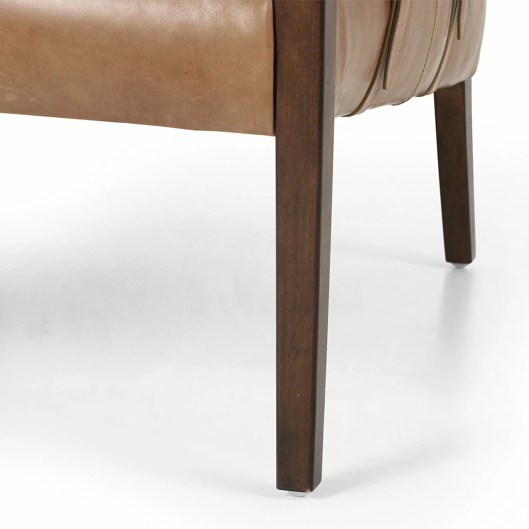 Lush top-grain leather seating fastens to wood framing via trend-forward buckles. Angular arms honor mid-century design, adding a throwback feel to a cutting-edge look.