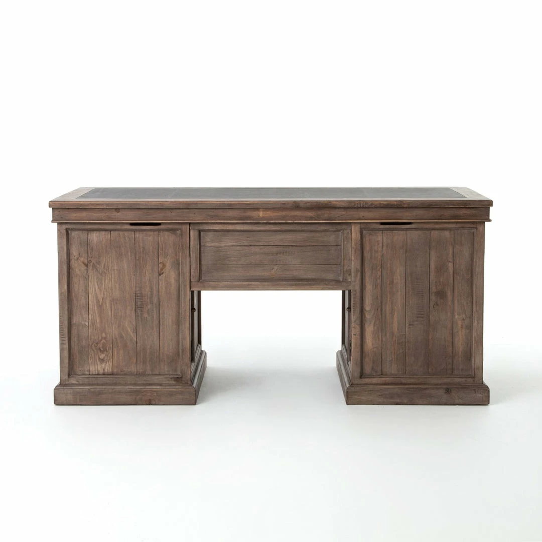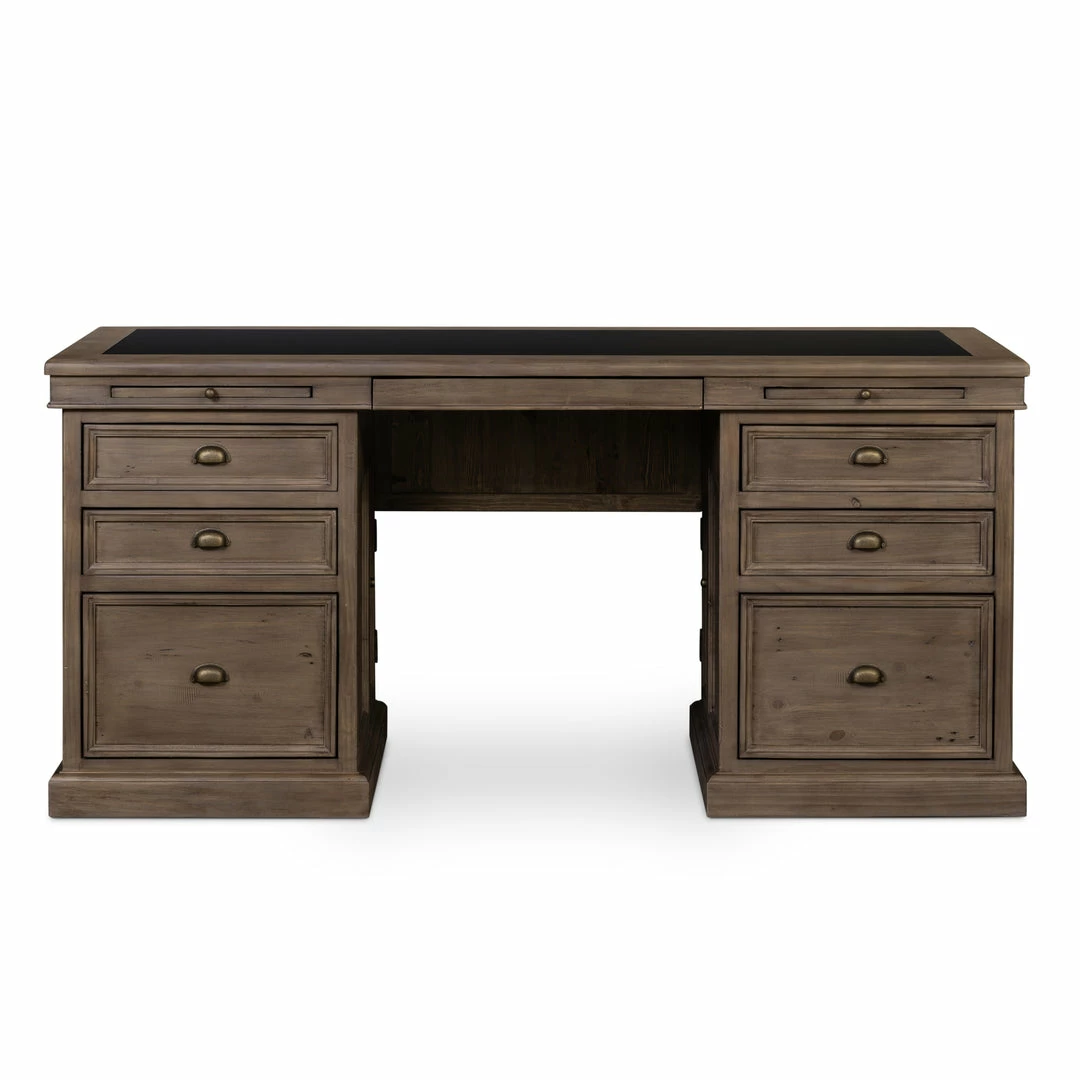 Borrowing inspiration from the classic lawyer’s desk with an inlaid leather top and French-inspired detailing. Finished in warm, sun-dried wheat tones with cast brass hardware.