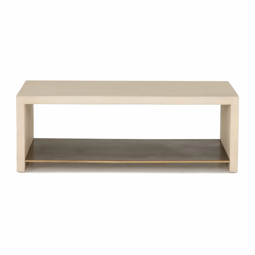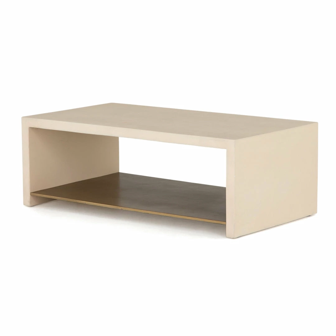 This minimalist modern coffee table features a natural parchment concrete waterfall frame with a floating antique brass finished shelf adding energy and excitement to any space.