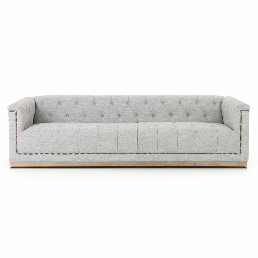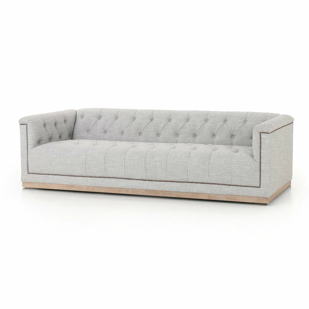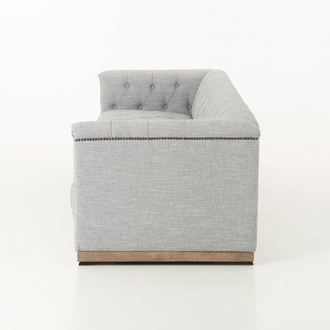 A classic tufted sofa in a light grey poly/cotton blend upholstery on a whitewashed parawood base finished in aged bronze nail headsΒ