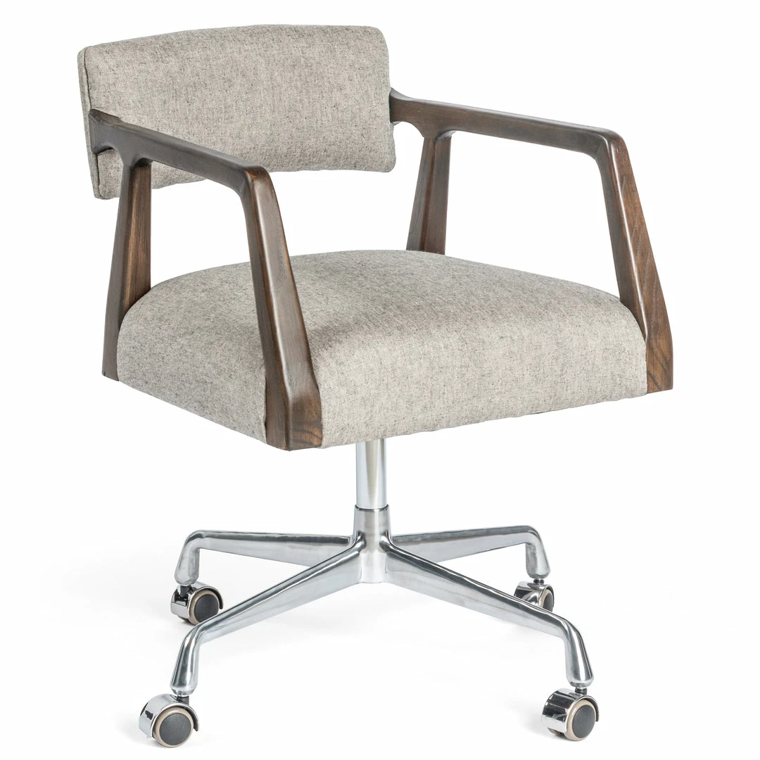 An angular, dark and smoky birch frame holds a deep seat and striking, low-slung back. Covered in a heathered stone seating fabric. Metal casters make for ease in the workplace.