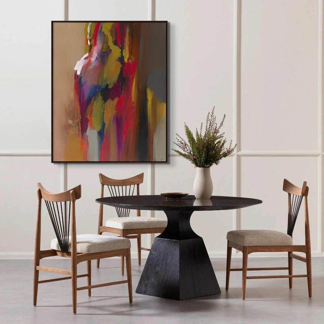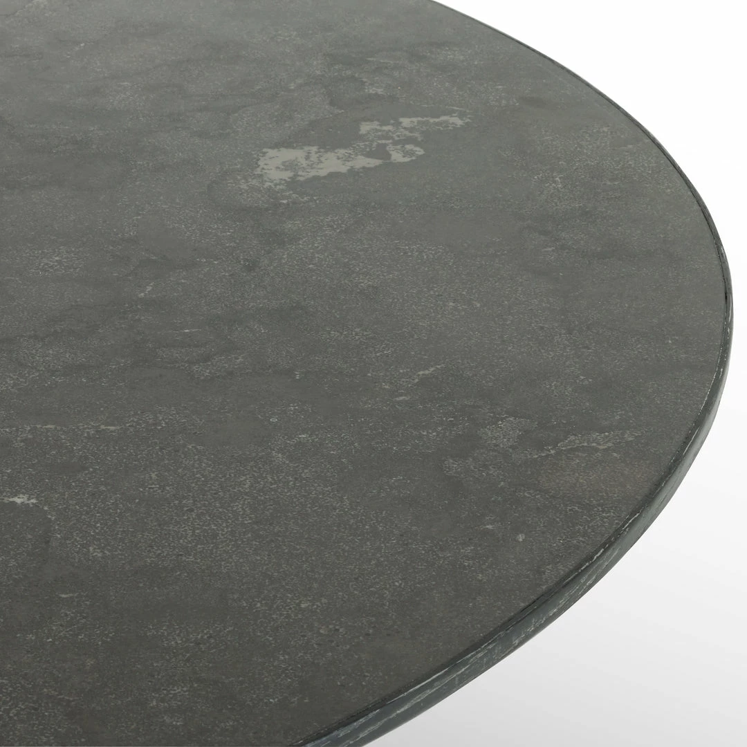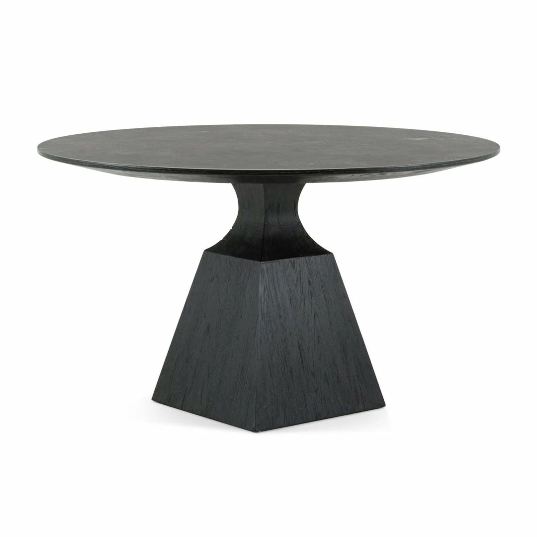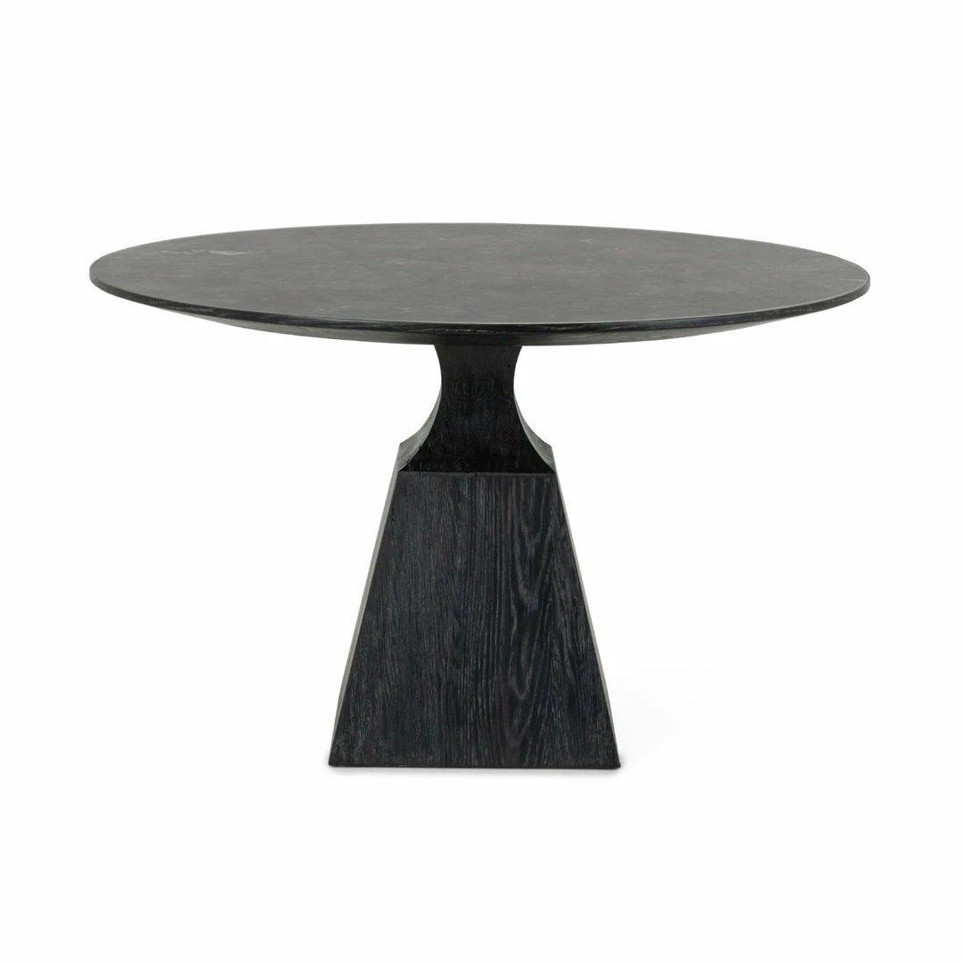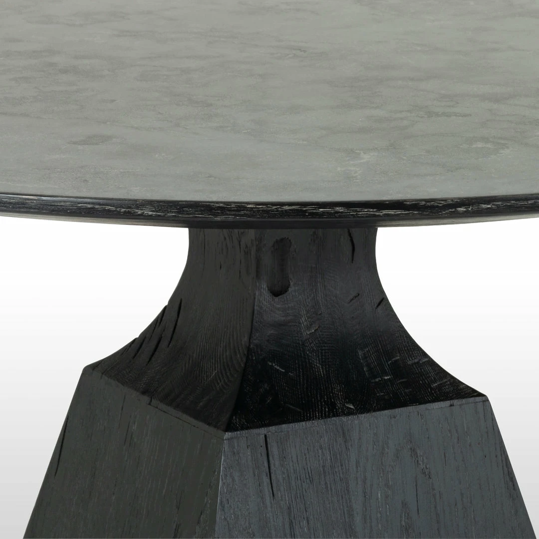 A bell-shaped pedestal base of black oak is wire-brushed for extra texture, while a rounded top of bluestone brings a touch of industrialism to the table.