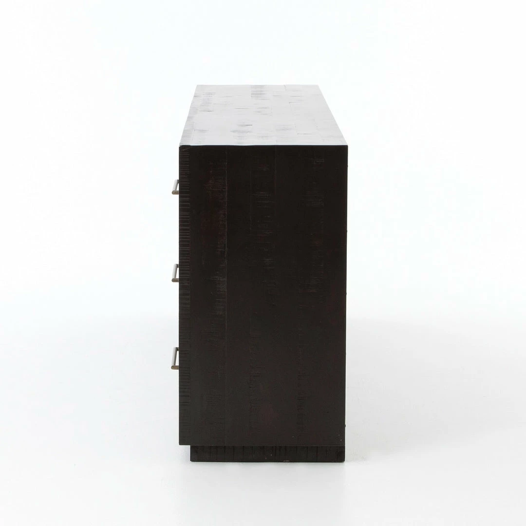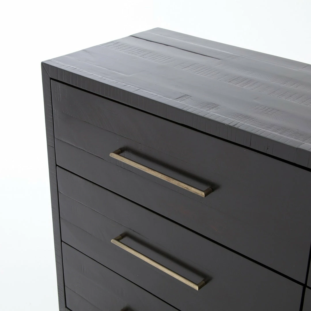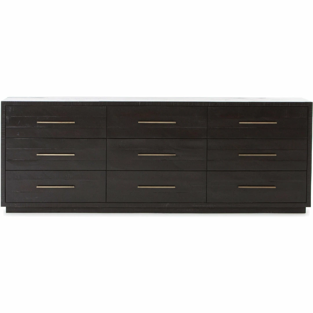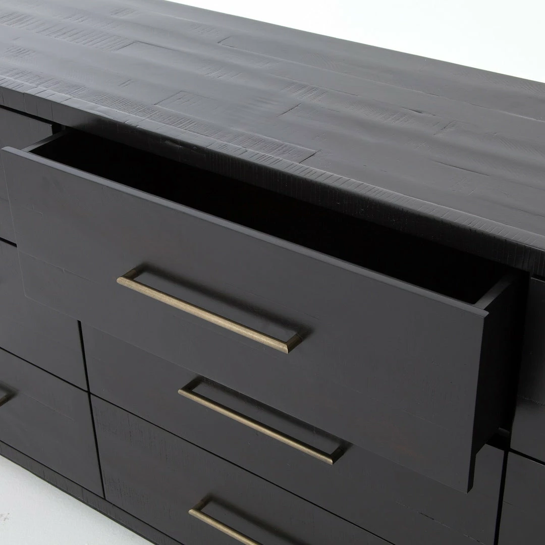 Simple with a modern edge. Solid acacia in a burnished black finish forms clean lines while brass hardware adds a sleek touch to nine spacious drawers.