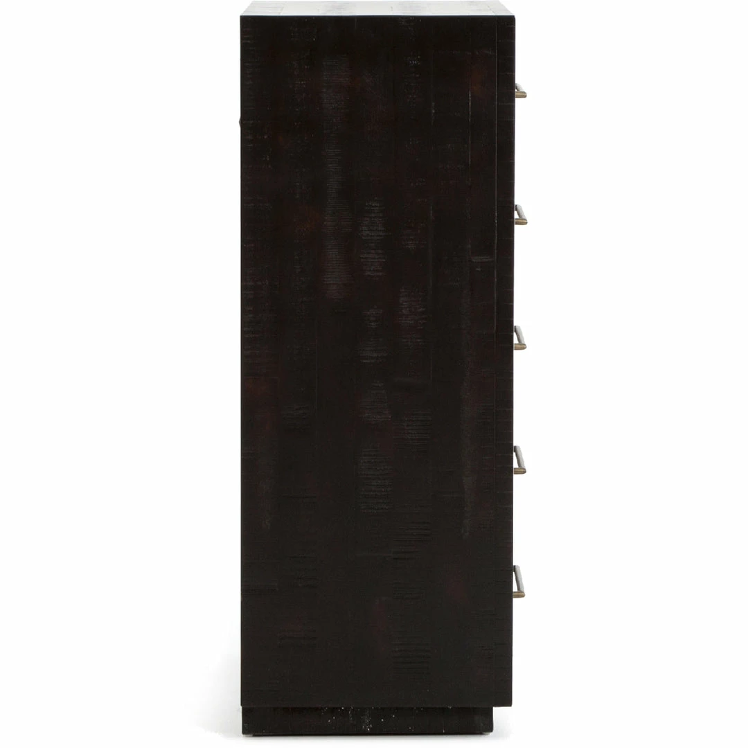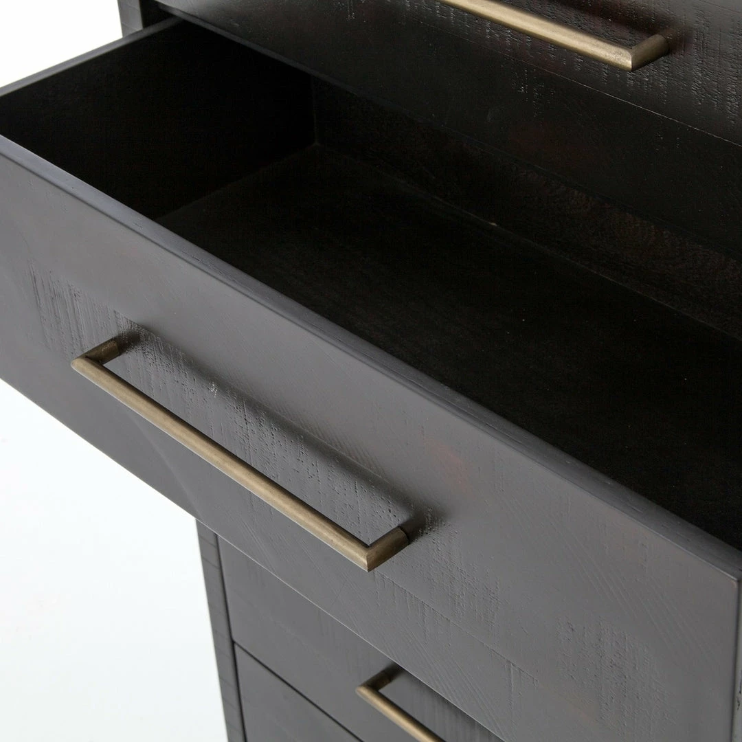 Simple with a modern edge. Solid acacia in a burnished black finish forms clean lines while brass hardware adds a sleek touch to five spacious drawers.