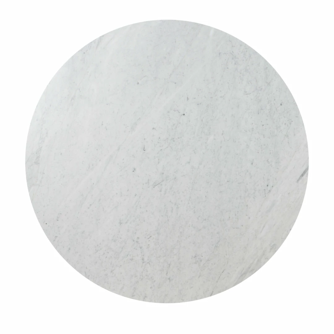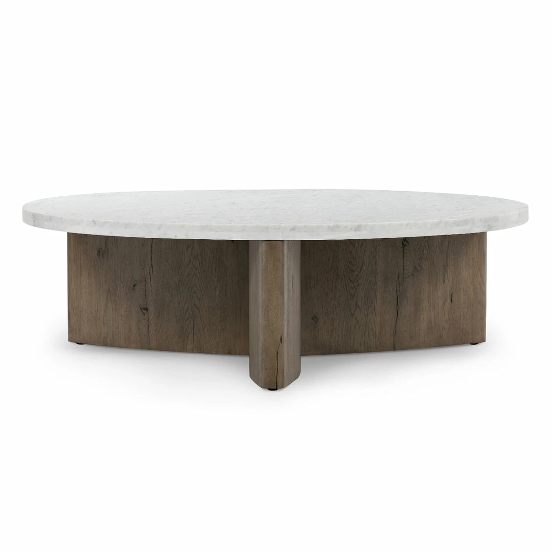 Mixed materials make the table. Finished in a rustic grey, thick-cut oak forms a chunky pedestal base for a rounded tabletop of white Italian marble, with beautifully subtle natural veining.