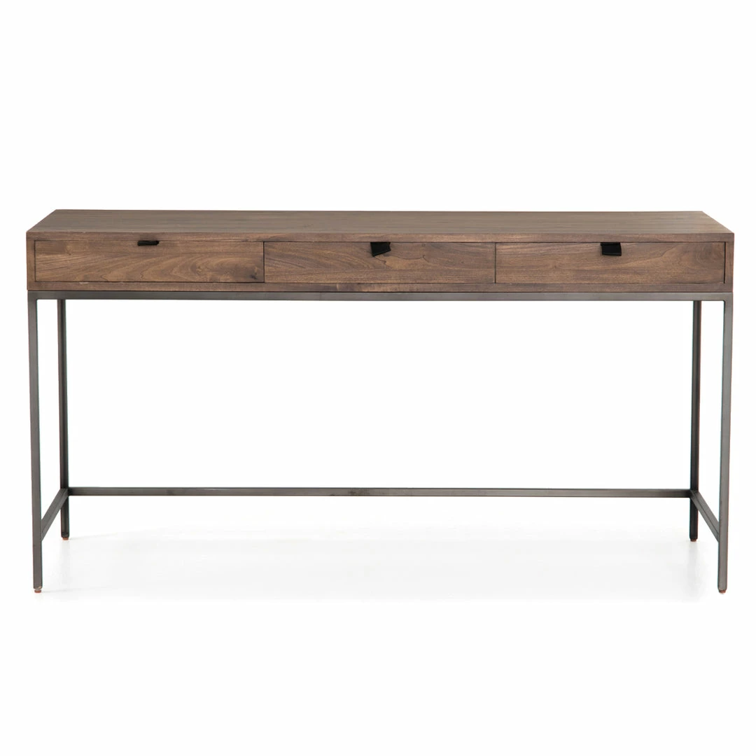 Inspired by clean mid-century design, greyish auburn poplar offers plenty of desk storage by way of three spacious drawers. Metal-secured leather pulls add a textural element of surprise. Great solo or paired with matching corner desk, file cabinet or credenza.