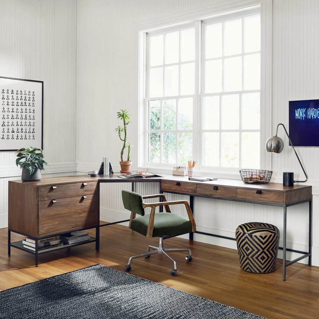 Inspired by clean mid-century design, greyish auburn poplar offers plenty of extra desk storage space. Metal-secured leather pulls add a textural element of surprise. Great solo or paired with matching desk or credenza.