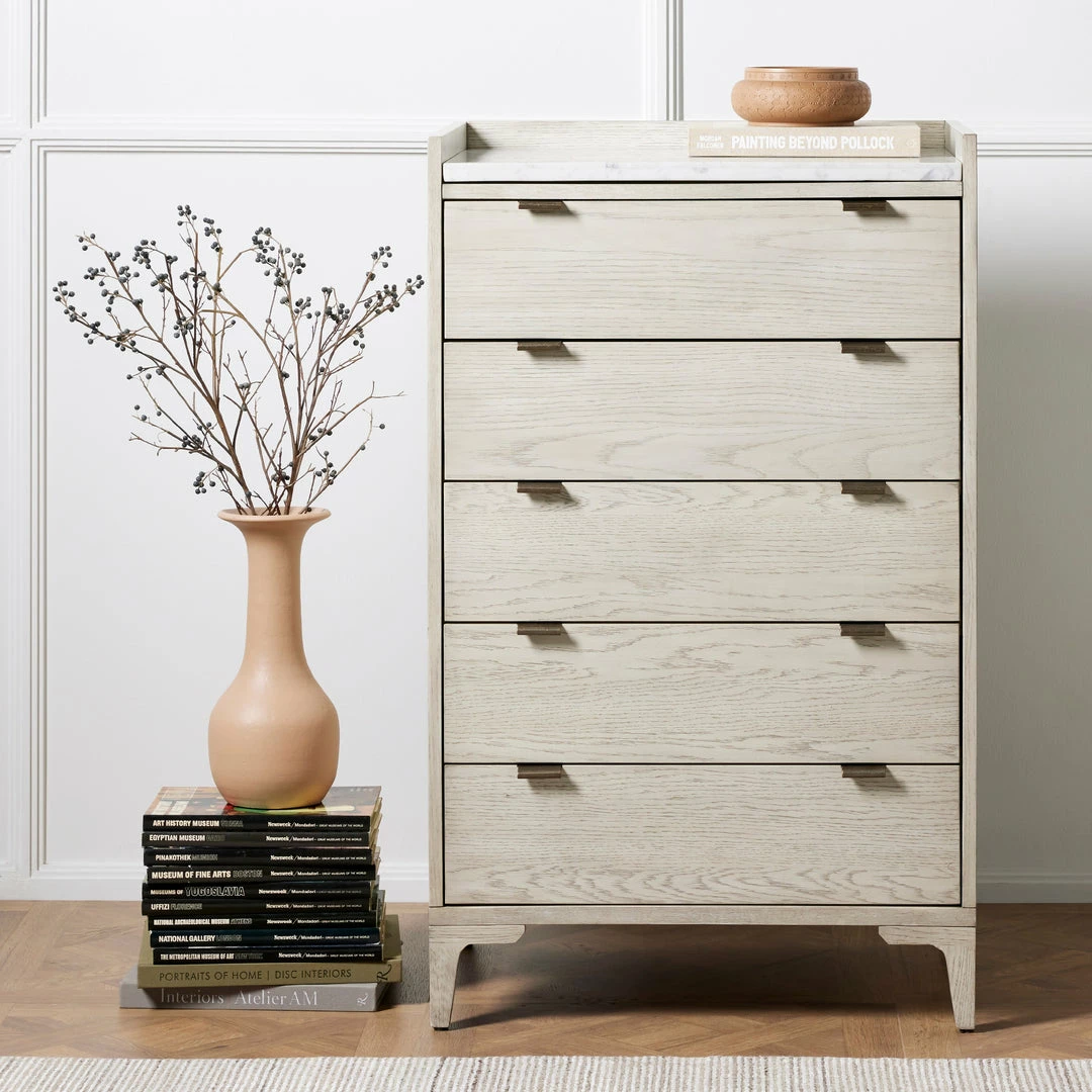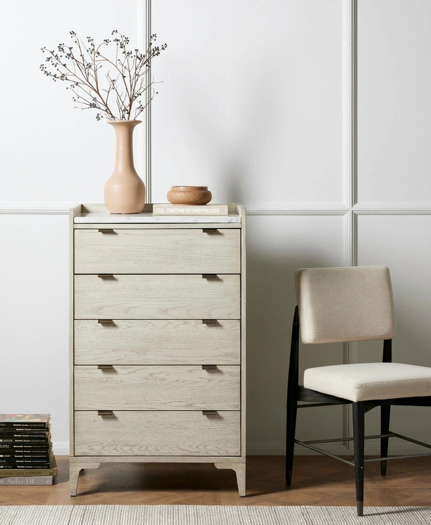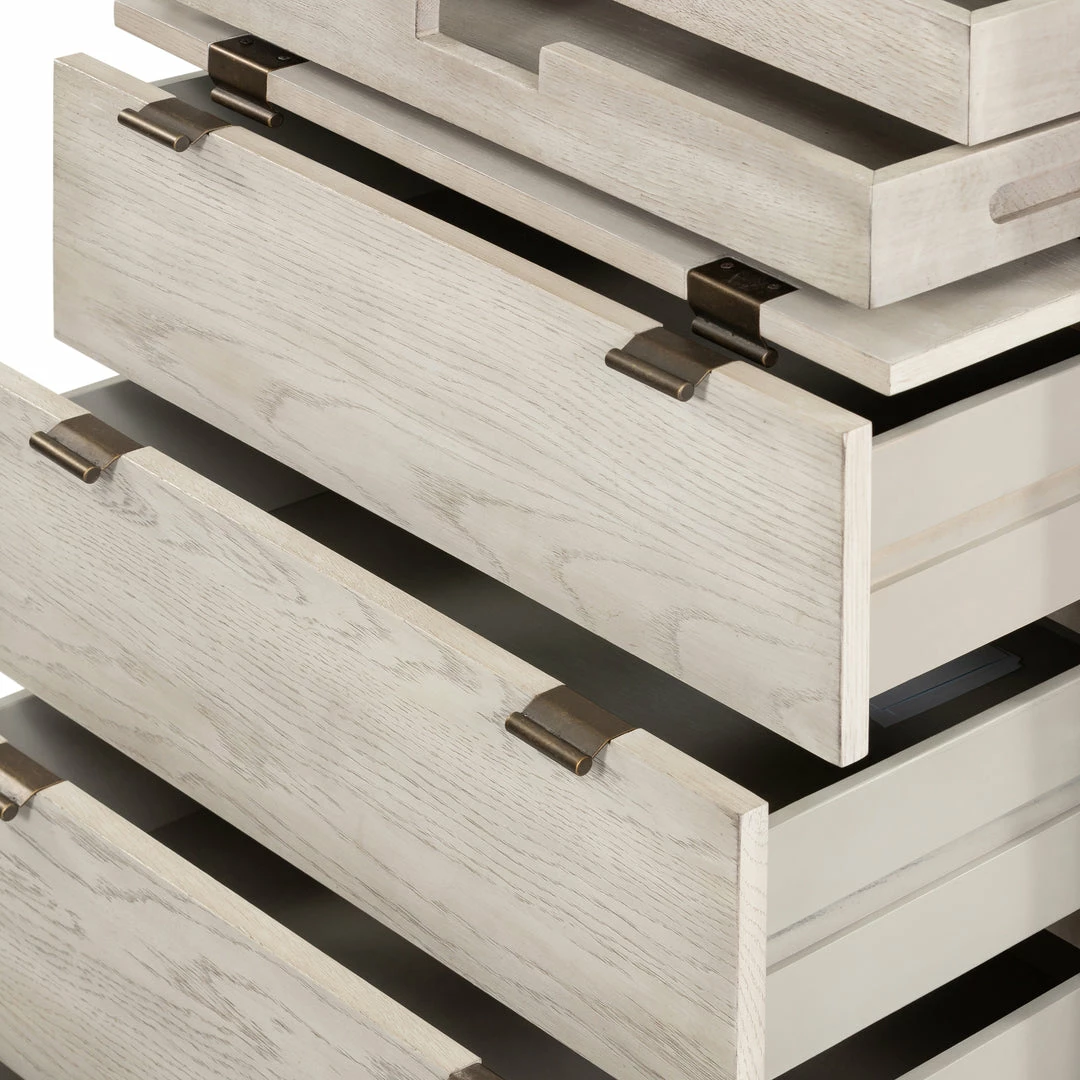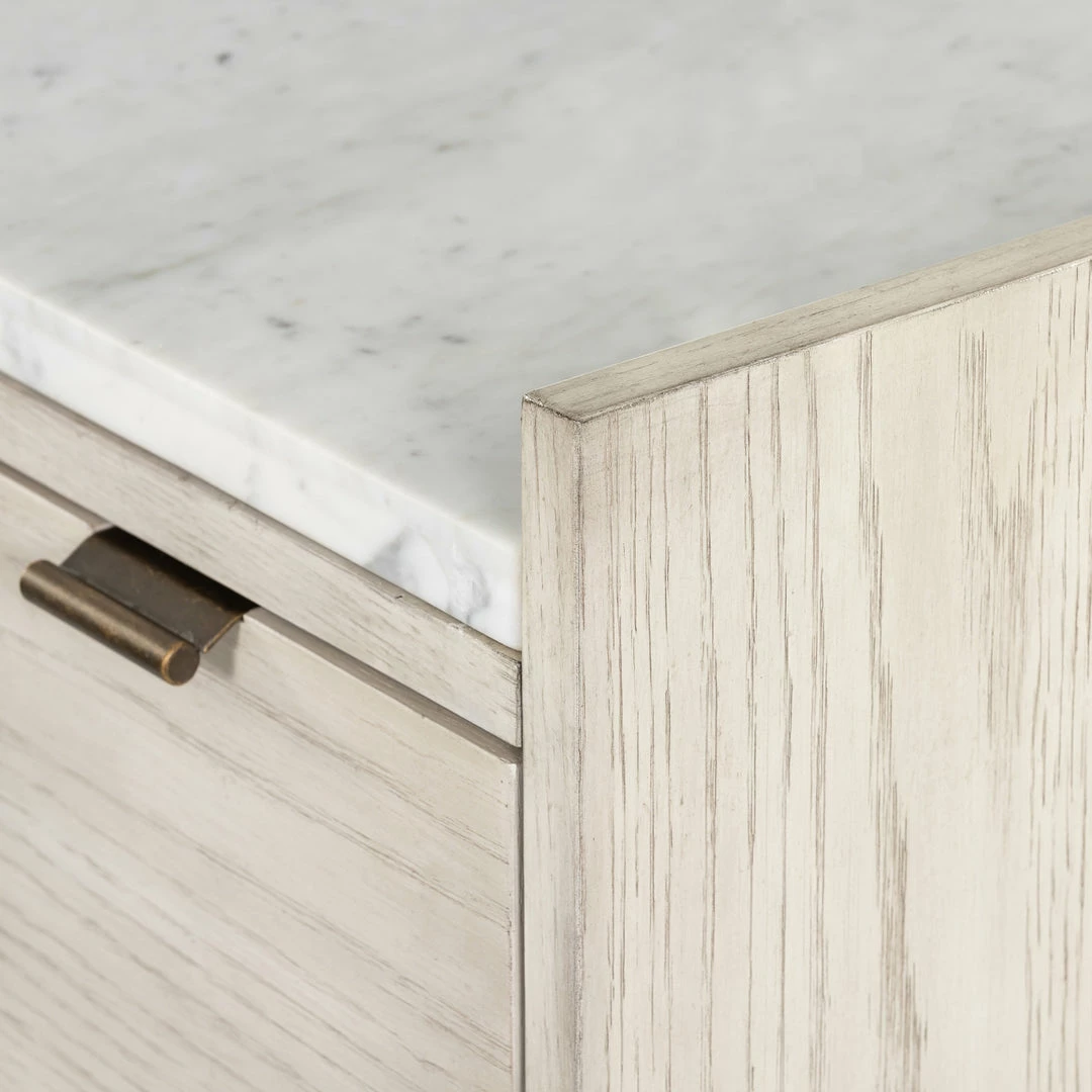 Vintage white oak is finished with a dry hand for a light look, while a top of white Italian marble offers a sophisticated material mix. Top drawer features a clever drop-down front, revealing two smaller drawers, perfect for storage of jewelry and accessories.